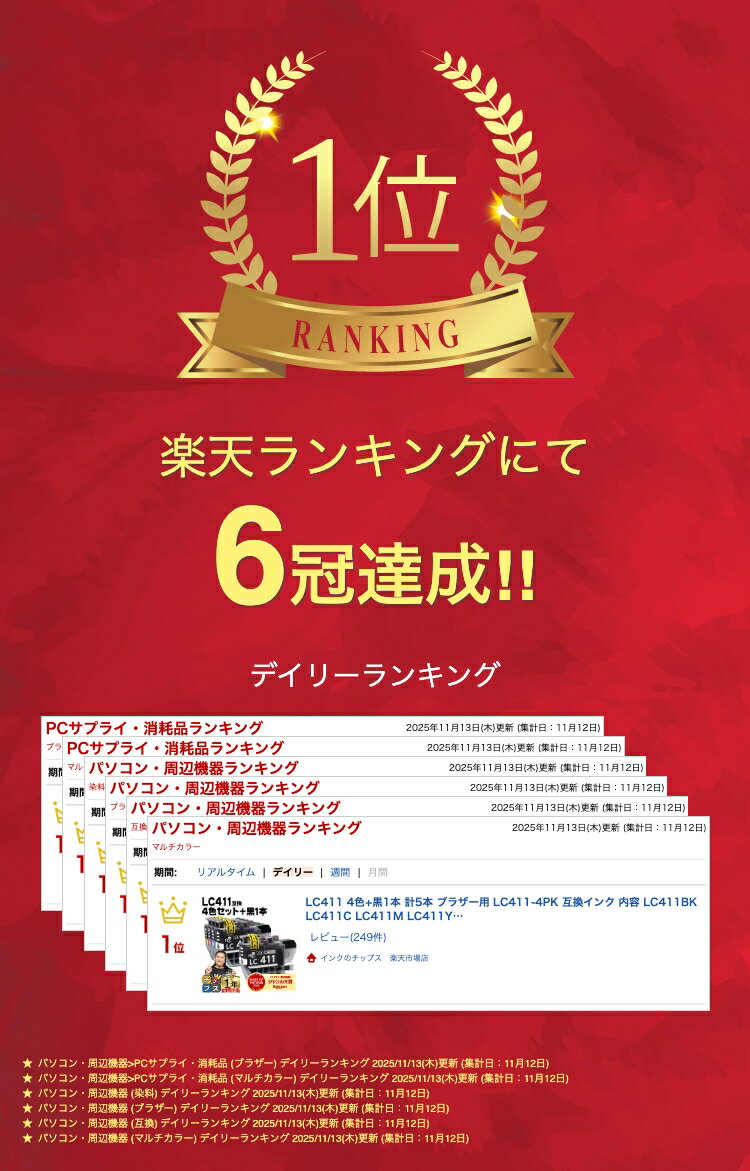 LC411 4色+黒1本 計5本 ブラザー用 LC411-4PK 互換インク 内容 LC411BK LC411C LC411M LC411Y 機種 DCP-J526N DCP-J924N DCP-J926N-W DCP-J926N-B DCP-J1800N MFC-J739DN MFC-J904N MFC-J739DWN MFC-J939DN MFC-J939DWN など