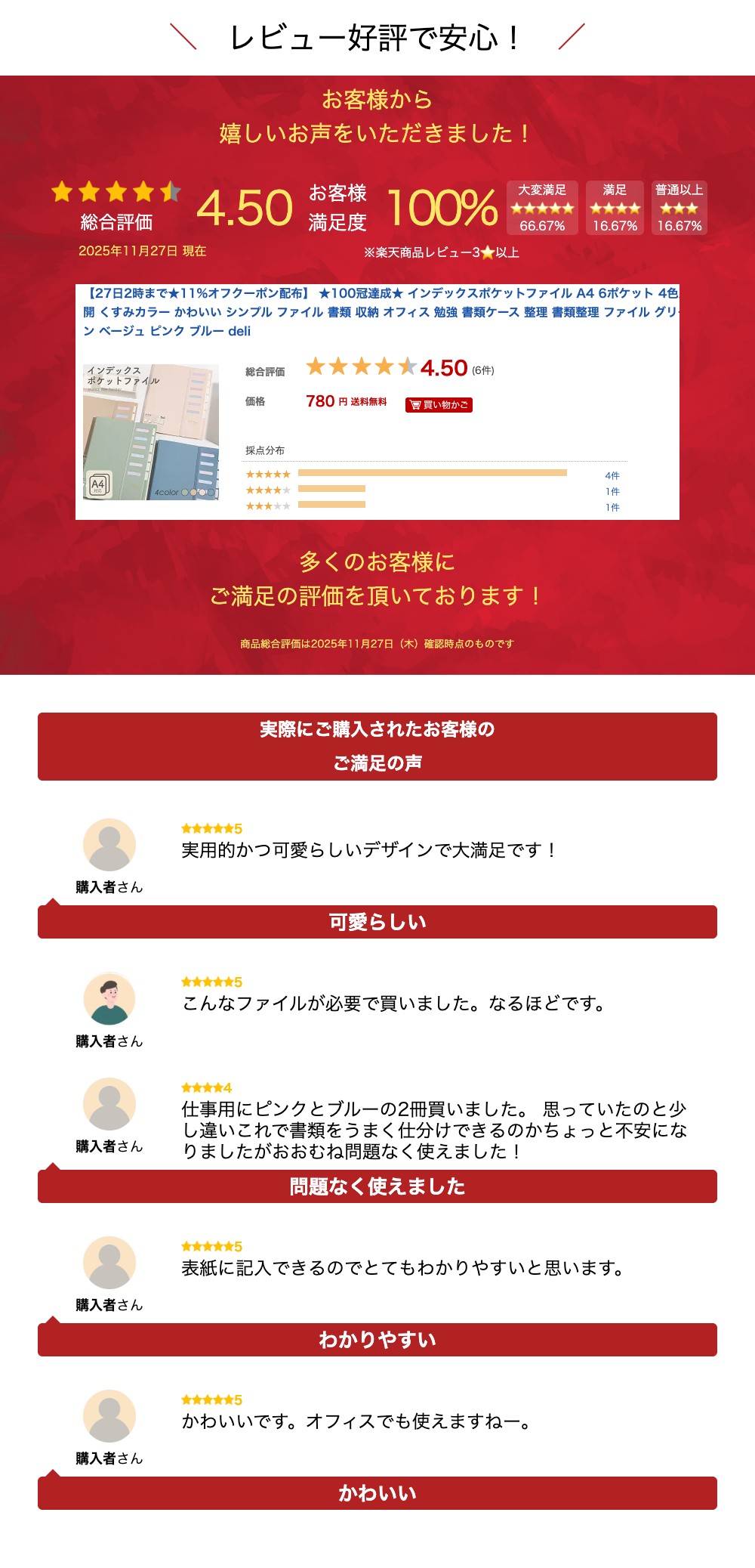 イベントキーワード ワンダフルデー お買い物マラソン マラソン スーパーSALE スーパーセール 0の付く日 5の付く日サイズA4サイズ対応320mm×245mm×12mm素材 ポリプロピレンカラーグリーンベージュピンクブルー検索キーワード 入学 卒業 入園 卒園 入学祝い 入園祝い 卒業祝い 卒園祝い Nusign インデックスポケットファイル A4 6ポケット 4色展開 くすみカラー かわいい シンプル ファイル 書類 収納 オフィス 勉強 書類ケース 整理 書類整理 ファイル グリーン ベージュ ピンク ブルー deli 社会人 大学生 高校生 中学生 小学生 OL 事務 会社 仕事 可愛い 注意事項 ・サイズは個体により若干の差異がある場合がございます。 ・お使いのモニターやブラウザ等の違いにより、色の見え方が実物と若干異なる場合がございます。 ・製品改良により、仕様・デザイン等を予告なく変更する場合がありますのでご了承ください。 ・輸入商品のためパッケージに日本語の記載のない商品もございます。 ・ギフト用のラッピング対応は承っておりません。予めご了承ください。Nusign インデックスポケットファイル A4 6ポケット 4色展開 くすみカラー シンプル ファイル 書類 収納 オフィス 勉強 書類ケース 整理 書類整理 ファイル グリーン ベージュ ピンク ブルー deli Nusign インデックスポケットファイル A4 6ポケット 4色展開 くすみカラー シンプル ファイル 書類 収納 オフィス 勉強 書類ケース 整理 書類整理 ファイル グリーン ベージュ ピンク ブルー deli 【商品説明】・インデックス付きのA4サイズ対応のポケットファイルです。・6ポケット内蔵で、1ポケットあたりA4用紙最大30枚ずつ収納が可能な大容量のファイルです。・学校の資料や取扱説明書、カタログ、オフィスでの書類などの整理整頓に、様々なシーンでお使いいただけます。・くすみカラーがかわいい選べる4色展開です。・柔軟性に優れたポリプロピレン素材を使用しています。つなぎ目の部分は頑丈に作られており、破れにくくなっています。 【返品交換について】・商品本体が破損・汚損していた場合、お届け後30日間以内にご連絡ください。※お客様都合での返品・交換および発送後のキャンセルは受け付けておりません。予めご了承の上、ご注文ください。※輸送上、パッケージの潰れや汚れなどがある場合がございますが、不良品と判断しておりません。