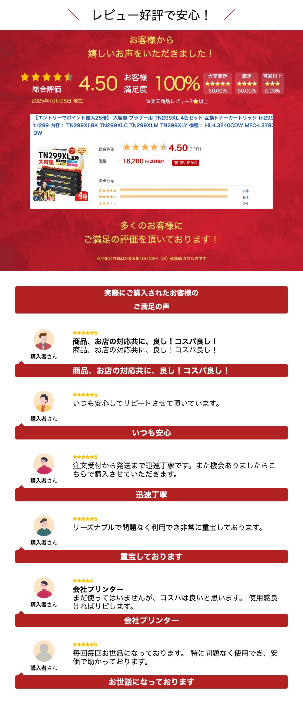 イベントキーワード ワンダフルデー お買い物マラソン マラソン スーパーSALE スーパーセール 0の付く日 5の付く日検索キーワード プリンター 複合機 印刷 トナー トナーカートリッジ となー 互換 互換トナー 互換トナーカートリッジ ブラザー 用 ぶらざー BRPTHER brother 用 Brother 用 TN299XL tn299xl TN299 tn299 TN-299XL tn-299xl TN-299 tn-299 HL-L3240CDW トナー MFC-L3780CDW トナー HL-L3240CDW トナーカートリッジ MFC-L3780CDW トナーカートリッジ hl-l3240cdw トナー mfc-l3780cdw トナー hl-l3240cdw トナーカートリッジ mfc-l3780cdw トナーカートリッジ 大容量 ブラック シアン マゼンタ イエロー 使用上のご注意 こちらの商品は互換トナーカートリッジです。純正品ではございません。 ご使用直前まで開封せず、高温、凍結、湿気の多い状態での保管は商品劣化する場合がございますのでお控えください。 印字枚数はA4用紙に5%密度で印字した場合の参考値となります。用紙サイズ、文字数、印字する用紙などにより、印字枚数が大幅に変わる場合がございます。 純正品と比べ色合いが違う場合がございますが新品交換/返金対象とはなりませんので、予めご了承くださいませ。 万一、弊社互換トナーの使用によるプリンターの故障などが発生した場合、直前のご購入いただいた商品金額を上限として保障させていただきます。 本製品を使用したことによる他の機器の故障や不具合につきましては、責任を負いかねますので予めご了承ください。またその他の損失・損害につきましても同様となります。 商品やパッケージが発送時期によって異なる場合がございます。品質に関しての仕様変更はございませんので、ご安心ください。 上記以上の保障は負いかねますので、ご不安ご心配な方は純正品のご利用をお勧め致します。画像の箱のデザインはイメージ画像であり、実際の商品のパッケージとは異なる場合がございます。商品の内容と品質には自信を持っておりますので、安心してご注文ください。【全色大容量】 ブラザー用 Brother用 TN299XL 4色セット 互換トナーカートリッジ 【全色大容量】 ブラザー用 Brother用 TN299XL 4色セット 互換トナーカートリッジ 【商品説明】・本製品は純正品と同様にご利用いただける互換トナーカートリッジです。メーカー純正品ではございません。残量表示対応のICチップを搭載。純正トナーとの併用も動作確認済みです。・ トナーカートリッジを交換した際に、製品の仕様上、不認識(エラー)となる場合がございます。その場合、一度電源を落とし、再度つけなおしていただければ通常通りご使用可能です。 ・印刷品質のみならず、プリンタ本体にもダメージを与えかねない粗悪なトナーパウダーは使用しておりませんので、安心してご使用いただけます。 ・印刷枚数は純正品サイズと同じ、ブラック約3,000枚 / シアン・マゼンタ・イエロー 各約2,300枚の印刷が可能です。(ISO/IEC 19798 に基づく)カラ打ち防止のため、トナーパウダーは多めに入っており、使用後も若干残りますが異常ではありません。 ・製造時には、パウダーを充填してから印字不良が起こらないよう、寿命テストを実施しています。製造品質工程管理を徹底した工場にて、厳しい基準をクリアしたもののみ商品として販売しております。 ・ISO9001認証を取得した工場で生産された高品質商品です。 ・トナーカートリッジの品質維持のため、トナーカートリッジはひとつずつ個包装をしております。 ・改善が必要とされる場合は、当社の担当スタッフより海外提携工場と直接やり取りを行っております。連携を密にとり、品質の維持や向上に努めております。【サポートについて】・ご注文日より1年間の保証期間を設けております。万が一の不具合の際は交換等、サポートさせていただきます。・ご不明点はメールだけではなく、お電話でもお問い合わせいただけます。専門スタッフが常駐する国内のコールセンターにて受け付けております。(平日10:00〜17:00)・お問い合わせメールは24時間受け付けております。専門知識をもったスタッフより必ず返信をさせていただきます。・ドラムカートリッジは、メーカー純正品または当店で販売している互換・再生品をご使用ください。他社製の互換ドラムカートリッジとの動作確認は行っておりません。・ご購入前の相談も承っておりますので、お気軽にご連絡ください。 スペック詳細 対応メーカー ブラザー(BROTHER) 純正品番 TN299XLBK(ブラック)TN299XLC(シアン)TN299XLM(マゼンタ)TN299XLY(イエロー) 印刷枚数 ブラック(約3,000/本)カラー(約2,300/本) (印刷可能枚数は、A4用紙・画像面積比5%で連続印刷したときの参考値です。印刷内容や(文書・写真)、用紙サイズ、用紙の種類、使用環境などによって実際の印刷枚数は異なります。) セット内容 ■ TN299XLBK(ブラック)×1本■ TN299XLC(シアン)×1本■ TN299XLM(マゼンタ)×1本■ TN299XLY(イエロー)×1本 対応機種 HL-L3240CDW / MFC-L3780CDW