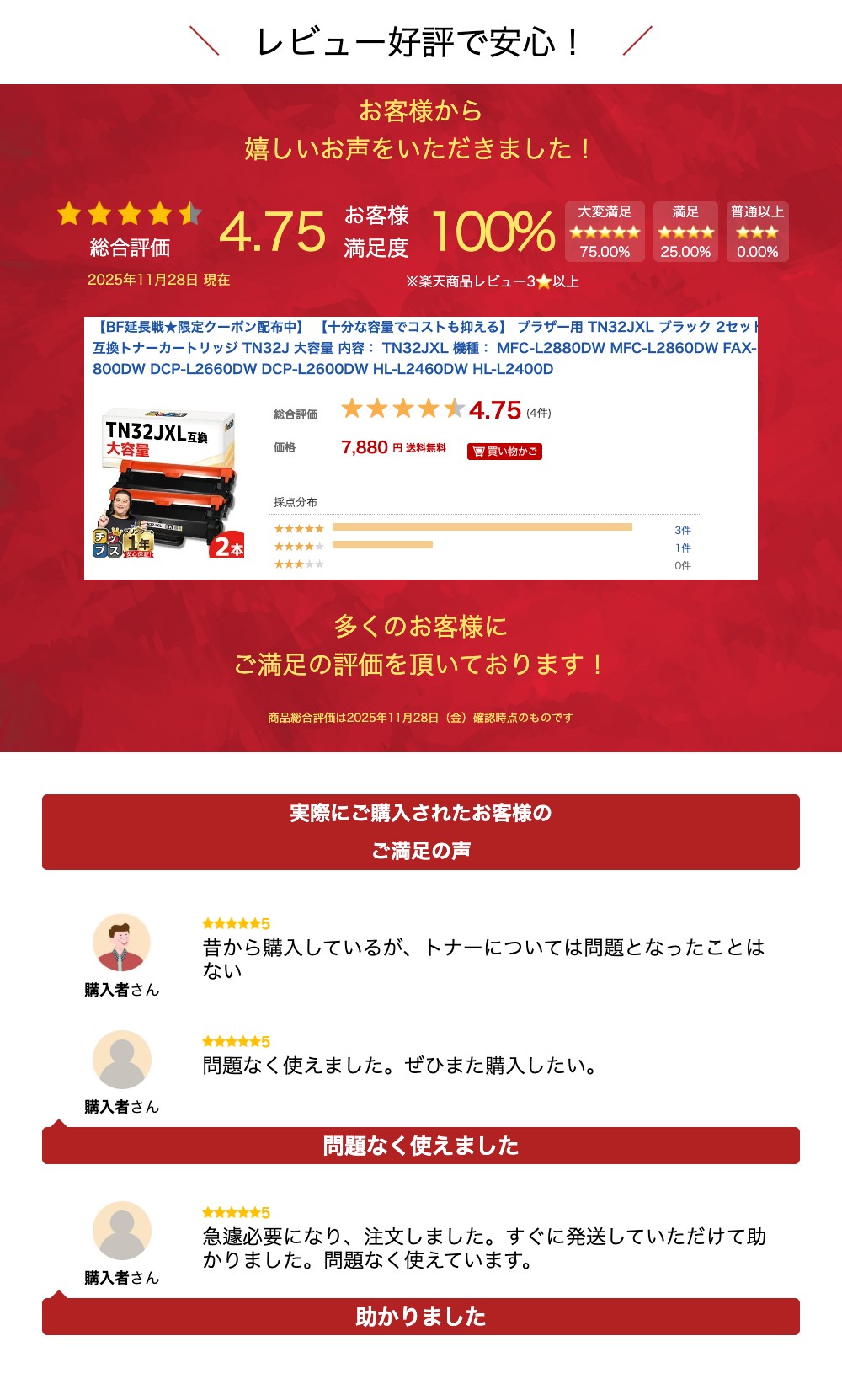 イベントキーワード ワンダフルデー お買い物マラソン マラソン スーパーSALE スーパーセール 0の付く日 5の付く日検索キーワード 印刷 プリンター 複合機 トナー トナーカートリッジ 互換 互換トナー 互換トナーカートリッジ ブラザー 用 BROTHER 用 brother 用 ぶらざー ブラック モノクロ TN32 tn32 TN32J tn32j TN32JXL tn32jxl Tn-32J tn-32j Tn-32JXL tn-32jxl 32J 32j 32JXL 32jxl MFC-L2880DW トナー MFC-L2860DW トナー FAX-L2800DW トナー DCP-L2660DW トナー DCP-L2600DW トナー HL-L2460DW トナー HL-L2400D トナー MFC-L2880DW トナーカートリッジ MFC-L2860DW トナーカートリッジ FAX-L2800DW トナーカートリッジ DCP-L2660DW トナーカートリッジ DCP-L2600DW トナーカートリッジ HL-L2460DW トナーカートリッジ HL-L2400D トナーカートリッジ dcp-l2600dw トナー fax-l2800dw トナー hl-l2460dw トナー mfc-l2860dw トナー mfc-l2880dw トナー dcp-l2600dw トナー dcp-l2660dw トナー hl-l2400d トナー mfc-l2860dw トナー mfc-l2880dw トナー tn32j tn32jxl ブラザー tn32j ブラザー tn32jxl hl-l2460dw トナー 84XXM200147 使用上のご注意 こちらの商品は互換トナーカートリッジです。純正品ではございません。 ご使用直前まで開封せず、高温、凍結、湿気の多い状態での保管は商品劣化する場合がございますのでお控えください。 印字枚数はA4用紙に5%密度で印字した場合の参考値となります。用紙サイズ、文字数、印字する用紙などにより、印字枚数が大幅に変わる場合がございます。 純正品と比べ色合いが違う場合がございますが新品交換/返金対象とはなりませんので、予めご了承くださいませ。 万一、弊社互換トナーカートリッジの使用によるプリンターの故障などが発生した場合、直前のご購入いただいた商品金額を上限として補償させていただきます。 本製品を使用したことによる他の機器の故障や不具合につきましては、責任を負いかねますので予めご了承ください。またその他の損失・損害につきましても同様となります。 上記以上の補償は負いかねますので、ご不安ご心配な方は純正品のご利用をお勧め致します。画像の箱のデザインはイメージ画像であり、実際の商品のパッケージとは異なる場合がございます。商品の内容と品質には自信を持っておりますので、安心してご注文ください。 【大容量版/十分な容量でコストも抑える】 ブラザー用 TN32JXL ブラック 2セット 互換トナーカートリッジ 【大容量版/十分な容量でコストも抑える】 ブラザー用 TN32JXL ブラック 2セット 互換トナーカートリッジ 【商品説明】 ・本製品は純正品と同様にご利用いただける互換トナーカートリッジです。メーカー純正品ではございません。残量表示対応のICチップを搭載。純正トナーとの併用も動作確認済みです。・印刷品質のみならず、プリンタ本体にもダメージを与えかねない粗悪なトナーパウダーは使用しておりませんので、安心してご使用いただけます。・印刷枚数は純正品サイズと同じ、約3,000枚の印刷が可能です。(ISO/IEC 19752 に基づく)・カラ打ち防止のため、トナーパウダーは多めに入っており、使用後も若干残りますが異常ではありません。・製造時には、パウダーを充填してから印字不良が起こらないよう、寿命テストを実施しています。製造品質工程管理を徹底した工場にて、厳しい基準をクリアしたもののみ商品として販売しております。・当社の日本人技術者による厳しい印字テストにも合格!・ISO14001、ISO9001及びトナーカートリッジの国際品質基準STMC(Standardized Test Methods Committee)認証を取得した工場で生産された高品質商品です。・トナーカートリッジの品質維持のため、トナーカートリッジはひとつずつ個包装をしております。・改善が必要とされる場合は、当社の担当スタッフより海外提携工場と直接やり取りを行っております。連携を密にとり、品質の維持や向上に努めております。【サポートについて】・ご注文日より1年間の保証期間を設けております。万が一の不具合の際は交換等、サポートさせていただきます。・ご不明点はメールだけではなく、お電話でもお問い合わせいただけます。専門スタッフが常駐する国内のコールセンターにて受け付けております。(平日10:00〜17:00)・お問い合わせメールは24時間受け付けております。専門知識をもったスタッフより必ず返信をさせていただきます。・ドラムカートリッジは、メーカー純正品または当店で販売している互換・再生品をご使用ください。他社製の互換ドラムカートリッジとの動作確認は行っておりません。・ご購入前の相談も承っておりますので、お気軽にご連絡ください。 スペック詳細 対応メーカー ブラザー(BROTHER) 純正品番 TN32JXL(ブラック) 印刷枚数 ブラック(約3,000/本)(印刷可能枚数は、A4用紙・画像面積比5%で連続印刷したときの参考値です。印刷内容や(文書・写真)、用紙サイズ、用紙の種類、使用環境などによって実際の印刷枚数は異なります。) セット内容 ■ TN32JXL(ブラック)×2本 対応機種 MFC-L2880DW / MFC-L2860DW / FAX-L2800DW / DCP-L2660DW / DCP-L2600DW / HL-L2460DW / HL