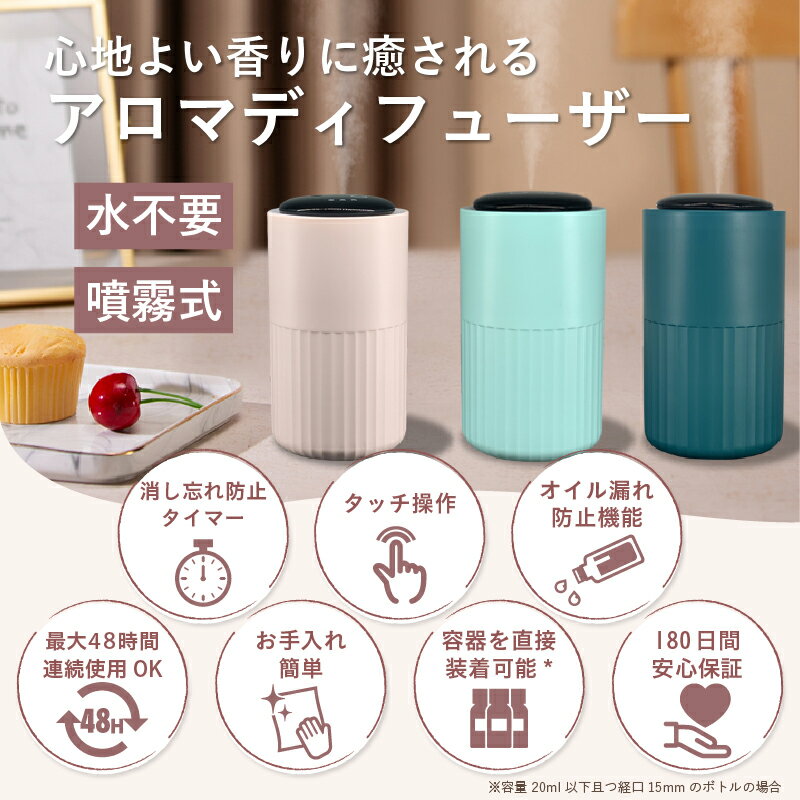 型番AD-SZ2021001-Aカラーブラック / ホワイト / ライトピンク / ミント / ネイビーグリーンサイズ本体サイズ:約70×120mm 重量約258g 材質PP / POM / ABS タイマー設定1時間3時間6時間8時間 噴霧量設定3分間に15秒噴霧3分間に30秒噴霧3分間に60秒噴霧 充電時間 / 最大使用時間約3〜4時間 / 約48時間 稼働音約40dB 適用範囲約18畳※ご使用環境により、変動する場合がございます。 ボトル容量20ml 対応オイル植物性エッセンシャルオイル揮発性アロマオイル 定格入力DC 5V/1A バッテリー容量2,000mAh ご使用上の注意 ・必ず付属のUSBケーブルをご利用ください。付属品以外を使用すると、発熱や火災の原因となる可能性があります。 ・製品のお手入れする際は、必ず電源を切ってから作業を行ってください。 ・アロマの噴霧口に顔を近づけないよう注意してください。 ・本製品を落としたり、強い衝撃を与えないでください。 ・本製品を修理、分解、または改造しないでください。 ・湿気の多い場所、ホコリが多い場所、直射日光が強く当たる場所、高温になる場所での使用や保管を避けてください。 ・ぐらついた台や傾いた場所など、不安定な場所に設置しないでください。 ・火のそばでの使用や保管は避けてください。 ・長時間本製品を傾けたり、裏返したりしないようにしてください。 ・小さなお子様の手が届かない場所で、 保管、 使用してください。 返品交換について ・商品本体が破損・汚損していた場合、購入日から180日以内にご連絡ください。 ※お客様都合での返品・交換および発送後のキャンセルは受け付けておりません。予めご了承の上、ご注文ください。 ※輸送上、パッケージの潰れや汚れなどがある場合がございますが、本体に影響を及ぼすような破損でない限り返品・交換の対象外となります。アロマディフューザー 水を使わない コードレス usb充電式 オイル漏れ防止機能 お手入れ簡単 タイマー付き 長時間 噴霧式 アロマディフューザー 水を使わない コードレス usb充電式 オイル漏れ防止機能 お手入れ簡単 タイマー付き 長時間 噴霧式 【商品説明】・お好きな場所で使える!水なし・コードレスの噴霧式アロマディフューザーです。 【純粋なアロマの香りを楽しむことができる】 ・水を使用しない為、アロマオイルの香りが薄まることなく、ダイレクトに広がります。 ・お手入れも簡単で、カビや雑菌が繁殖する心配が少ないです。 【持ち運び自由、様々な場所で使用可能】 ・コードレス仕様の為、玄関やリビング、車内など様々なシーンでご使用いただけます。 ・計量でコンパクトな為、家中はもちろん、オフィスや旅行先、車内にも手軽に持ち運べます。 【噴霧量調整機能付き】 ・ワンタッチで3段階に噴霧量を手軽に調整できます。 ・部屋の広さによって香りを控えめからしっかり広がる濃さまで調整できます。 【消し忘れ防止タイマー機能付き】 ・1時間、3時間、6時間、8時間と、使用シーンに合わせたタイマー設定が可能です。 ・必要な時間だけ使用することで、オイルの無駄遣いを防ぎ、消し忘れの心配もなく就寝前でも手軽に使用可能です。 【大容量バッテリー搭載】 ・最大48時間の連続使用が可能です。頻繁に充電する必要がなく、長時間快適な香りを楽しめます。 【オイル漏れ防止機能付き】 ・本製品は45°以上傾くと、自動的に運転を停止します。通常の位置に戻すと、再び動作を開始します。 ・万が一倒れても、自動で電源が切れるため、オイル漏れの心配がございません。 【使用可能なボトル】 ・経口15mm / 容量20ml以下のボトルは、詰め替え不要でそのままノズルに取り付けてご使用いただけます。 ・経口15mm以外のボトルは、付属のボトルに詰め替えでご使用いただけます。 【静音で就寝時も快適】 ・稼働音は約40dBのせい ・また、本製品のパネル部分がライトとして機能し、就寝時のナイトライトとしても最適です。 【使用可能なオイル】 ・植物由来のエッセンシャルオイルおよび揮発性のアロマオイルをご使用いただけます。 ※粘度の高いオイルやマッサージ用のオイルなどはノズルの詰まりや故障の原因となりますので使用しないでください。 【使い方&お手入れ簡単】 ・電源ボタンをタッチするだけで、すぐにご使用いただけます。シンプルな操作で、どなたでも手軽にお使いいただける設計です。 ・従来の水を使用するアロマディフューザーと比べ、使用後は噴霧口を綿棒などで軽くふき取り、ボトルとノズルを水洗いするだけで、清潔な状態を保てます。面倒な水タンクの洗浄が不要なため、日常的に快適にご利用いただけます。 【ギフトラッピングについて】 ・ギフトラッピングは、ご購入時に<ラッピング>の選択肢がある商品のみ対応可能です。ラッピングは商品ページごとに対応しているため、複数の商品をまとめてお包みすることはできません。異なる商品を同時にご購入いただいた場合は、ラッピングを選択された商品だけをお包みしてお届けいたします。(例)鉛筆削り