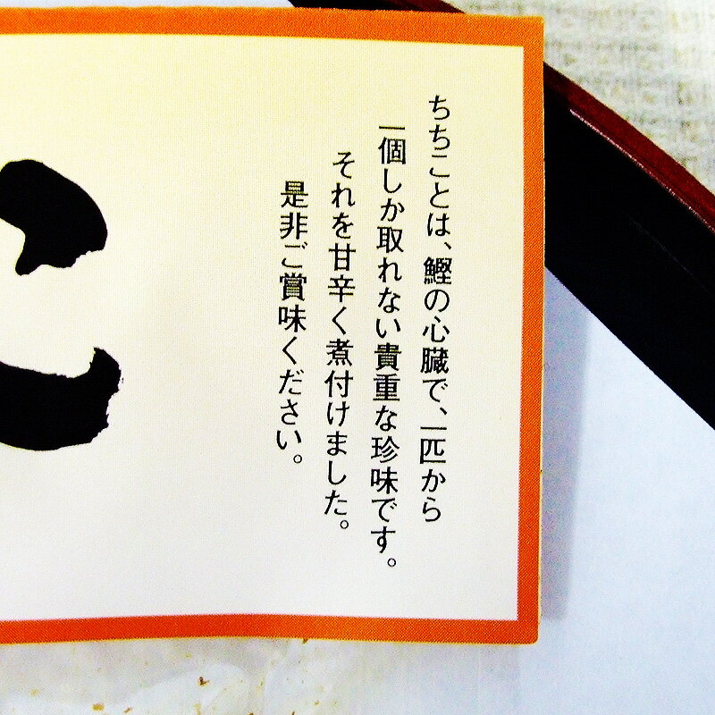商品情報名称鰹のちちこ煮原材料鰹の心臓(国産)、砂糖、水あめ、本醸造醤油、しょうが、発酵調味料、蜂蜜、食塩、唐辛子(原材料に小麦・大豆を含む)。内容量70g「ちちこ」とは?鰹の心臓の部分です。お届け常温便(送料料金表参照)でお届けします(ただし、代金引換の場合、手数料330円が別途必要です。)。同梱の可否常温便・冷蔵便・冷凍便すべてのお品物と同梱してお届けできます。ご注意稀少品のためお届けにお時間をいただく場合がございます。予めご了承くださいませ。【内容】鰹のちちこ煮 【「ちちこ」とは?】鰹の心臓の部分です。 【内容量】約70g 【原材料】鰹の心臓(国産)、砂糖、水あめ、本醸造醤油、しょうが、発酵調味料、蜂蜜、食塩、唐辛子(原材料に小麦・大豆を含む)。 【お届け】常温便(送料:料金表参照)でお届けします(ただし、代金引換の場合、手数料330円が別途必要です。)。 ※ 稀少品のためお届けにお時間をいただく場合がございます。予めご了承くださいませ。 【同梱の可否】常温便・冷蔵便・冷凍便すべてのお品物と同梱してお届けできます。鰹のちちこ煮 70g 高知産 鰹の心臓 ちちこ 心臓 煮つけ かつお カツオ 鰹 甘辛煮 珍味 吉永鰹節店 一匹から一個しかとれない貴重な「ちちこ(心臓)」の甘辛煮。ご飯のお供や酒の肴に 【一匹に一個しかとれない貴重な「ちちこ」】 鰹の本場、高知ならではの鰹の「ちちこ(心臓)」です。かつおの心臓を砂糖・醤油で甘辛く煮込みました。当然ながら、カツオ一尾に一個しかとれない珍味で、昔は地元漁師の酒の肴となり、一般には出回りませんでした。そのままでもお召し上がりいただけますが、袋のまま熱湯で温めていただくと柔らかくなり、さらにおいしくいただけます。土佐の珍味をぜひいちどおためしください。 一匹に一個しかとれない貴重な珍味 鰹の本場高知ならではの郷土料理 甘辛く煮つけてあるので、酒の肴にぴったり 一匹に一個しかとれない珍味を味わいたい方 鰹の本場ならではの郷土料理を楽しみたい方 美容や健康のため、ちちこの成分を摂取したい方 聞きなれない「ちちこ」とは、鰹の心臓のこと。日本一鰹をたべる高知の人にはなじみの食材です。甘辛く煮付けてあるので食べやすく、生姜を加えているのでくさみもありません。もともとは漁師村のおふくろの味・酒の肴として愛されてきましたが、最近は美容や健康によいと注目されることも増えてまいりました。貴重な鰹の「ちちこ」をぜひご賞味ください。 ご注文日から1週間以内に発送させていただきます。 1