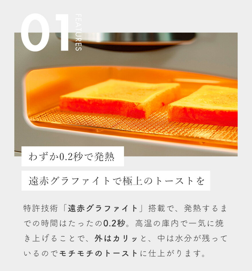 こちらの商品はギフトラッピング不可の商品です。 ラッピング希望にてご注文頂きました場合は、ラッピング無しにて発送し、当店にてラッピング料をご請求額から差し引き致します。 なお、ラッピング不可の理由による返品・返金対応はできかねますのでご了承くださいませ。 ◆商品情報 忙しい朝にこそ極上のトーストを。わずか0.2秒で発熱する「遠赤グラファイト」を搭載したトースター。 ◆商品特徴 <0.2秒で発熱> 特許技術「遠赤グラファイト」搭載で、発熱するまでの時間はたったの0.2秒。短時間かつ高温で一気に焼き上げることで、食パンの水分が中に保持された状態になり、外はカリッと、中は水分が残っているのでモチモチとしたトーストを焼き上げることができます。 <こだわりのメッシュ網> 【編み目が細かい】 パック餅を焼く際にアルミホイルを敷かなくても膨らんだお餅のくっつきを防ぎ、両面をしっかり焼くことができます。外はパリッと香ばしく、中はもっちりとしたおいしいお餅が焼けます。 【お手入れ簡単】 取り外しが可能なので、お手入れが簡単。メッシュ網になったことで食材が下に落ちにくく、トーストの裏面の焼きムラがさらに改善し、よりおいしいトーストを実現しました。 <フライの温め直しをサクッと> 天ぷら、唐揚げ、魚のフライなど、冷めてしまった揚げ物を温め直すときは、焼き網の下に受け皿を置いてから加熱します。余分な油を落として揚げたてのようなサクッとした食感をお楽しみいただけます。 <奥行きのある広々とした庫内> 奥行たっぷりで山形パンが2枚同時に焼け、直径18cmのピザも焼くことができます。 <使いやすさ> 【つまみ】 温度調節つまみ・タイマーつまみを大きくすることで操作性に優れています。 【パンくずトレイ】 引き出しタイプのパンくずトレイ。お片付けが簡単です。 【自動調整】 庫内温度を保つため設定温度に達すると自動的に「OFF」、庫内温度が下がると自動的に「ON」になります。 商品名 アラジン グラファイト トースター(2枚焼き) 保証期間 お買い上げ日から1年間 カラー グリーンホワイト 品番 AET-GS13C(G)(W) JANコード グリーン:4962365070448ホワイト:4962365070455 トースト枚数 2枚 温度調節 100℃〜280℃(無段階調節) 電源 交流100V 50-60Hz 定格消費電力 1270W 大きさ(約) <外寸>幅35 × 奥行29.5 × 高さ23.5 cm <庫内>幅31 × 奥行23.5 × 高さ8.7 cm 本体重量 約3.4kg コードの長さ 1.2m マイコン制御 × 安全装置 過昇防止サーモスタット 調理メニュー × 15分タイマー ○ 報知音付き 炊飯釜 × グリルパン × その他付属品 受け皿(ホーロー)