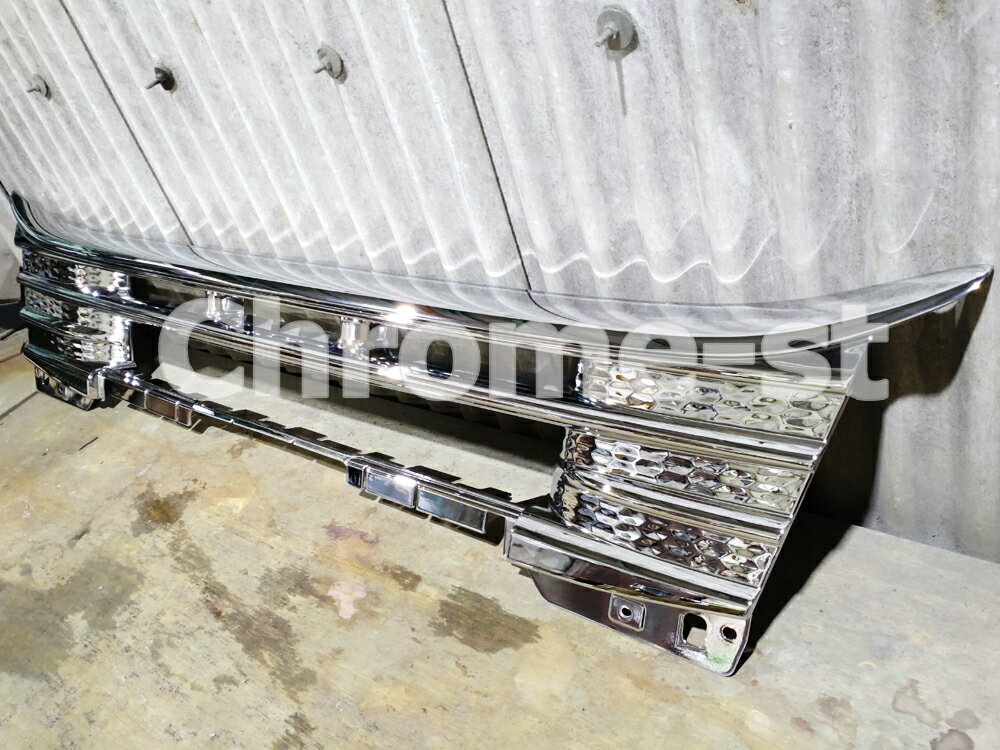 純正新品パーツにメッキの仕上がり・耐食性に優れた高品質なクロームメッキを施した商品です!!【完全受注生産】■24スーパーグレートフロントグリル下段に高品質メッキを施しました!純正部品を加工しているので安心のクオリティこの部位は純正メッキが出ていないため、メッキのフロントにこだわりたい方へおすすめの一品です。※こちらの純正部品は品番違いで2タイプあります。こちらは溝部分が3段になっているAタイプとなります。(2段タイプもあるのでお間違いないようご注意ください)◆注意こちらの商品は、在庫期間を設けず、より良い品質状態でお客様に納品できる様、完全受注生産となりますので納期までには2週間前後、お時間を頂戴致します。また、稀に部品がメーカー欠品の場合がございます。その時は納期について、お客様とご相談させていただきますので、宜しくお願い致します。・パーツメーカー純正品 新品を使用品番 ML340080・クローム加工日本バンパー販売株式会社製※適合は品番をディーラーにてご確認下さい。※装着は純正部品を使用している為、ディーラーでの装着をおすすめします。※一部純正パーツを外し、取り外したネジを再利用する場合がございます。※プラスチック製部品の場合、下地処理膜やメッキ膜が厚くなりますので、組み立て時や取付け時はクリアランス加工が必要になる場合がございます。※価格、仕様等は予告なく変更する場合がございます。※ブラウザにより実際の場合と発色が異なる場合があります。予めご了承下さい。 ★当ショップのオリジナル商品に無いものでもクロームメッキパーツとして欲しいものがございましたら、お気軽にお問い合わせ下さい!当ショップが新品パーツを発注し、クロームメッキ加工してお客様にお届けします!★また、パーツの持ち込みも可能です!※パーツの素材・腐食などで加工できない場合もありますお見積り無料!詳しくはTEL・FAX・mailにてお問い合わせ下さい。TEL 048-971-6924FAX 048-971-6925mail chrome-st@plum.ocn.ne.jp※ クーポンをご希望の方は商品レビューを書いた後のレビュー確認画面で[ショップへ注文番号を知らせる]に必ずチェックを入れて下さいね!