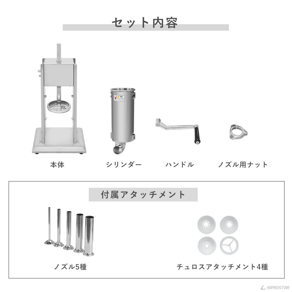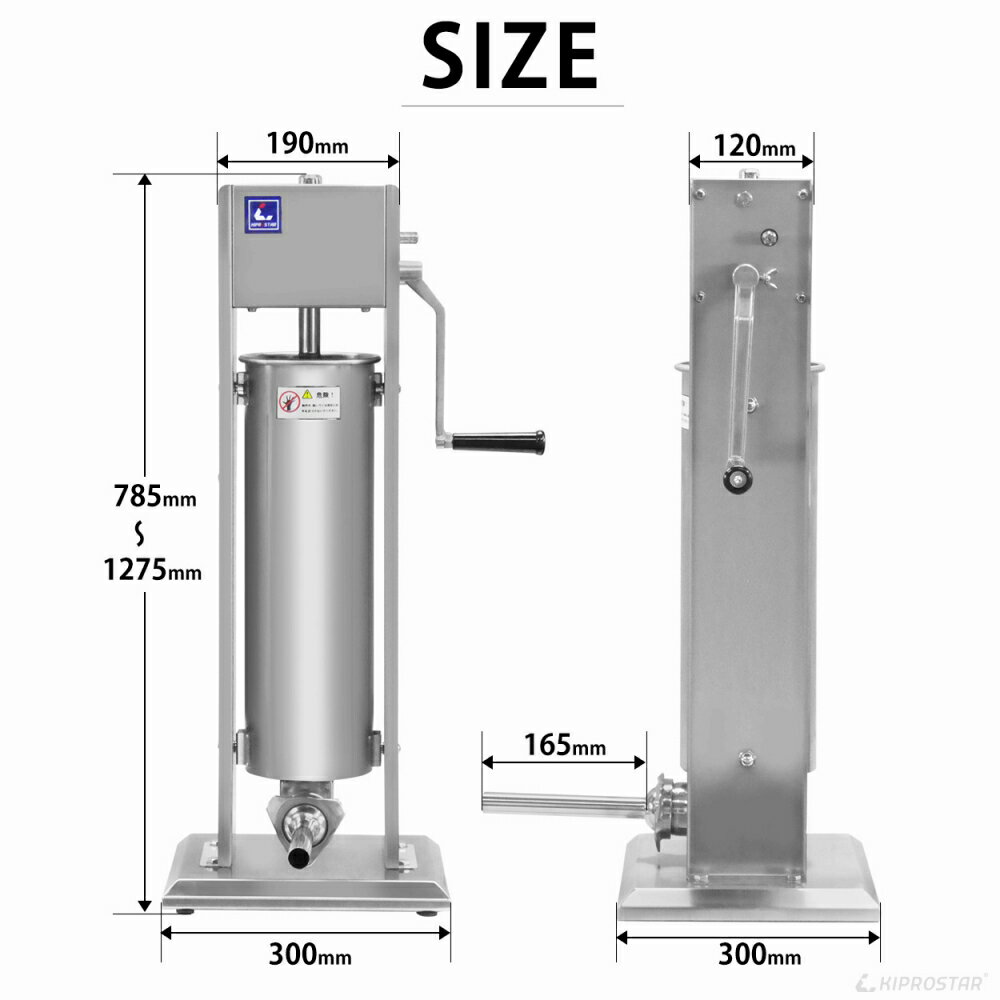 業務用 ソーセージスタッファー 7L PRO-YSS7 【型番】PRO-YSS-7 【容量】7L 【重量】(約)11Kg 【サイズ】(約)幅300mm×奥行300mm×高さ785~1275mm 【筒内径】φ138×高さ460mm 【材質】ステンレスSUS201 【挽肉の量】(約)4.6kg(約10.1ポンド) 【ノズルの有効長さ】 38mm:(約)167mm 32mm:(約)167mm 22mm:(約)167mm 16mm:(約)166mm 10mm:(約)166mm 【チュロスアタッチメント】4種類(センターパーツ含む) 【メーカー】KIPROSTAR(キプロスター) ※商品ハンドル部、本体にキズ等があるため格安にて販売しております。 ※当社1年保証付 保証期間外でも当社へご連絡頂ければ修理・メンテナンス等、迅速に対応させていただきますのでお気軽に当社へご相談下さい。 ・牛肉・豚肉・鶏肉・などの一般肉類にご使用頂けます。 ・スパニッシュソーセージ作り、メキシカンソーセージ作り、チョリソー作り、カクテルウインナー作り、ミニウィンナー作りにも活躍。 *注意 ハンドルを回してミンチを押し出す際、過負荷がかかると内部ギアが破損し故障の原因となります。 スムーズに押し出すことができないと感じた際には太いノズルをご使用いただくか、細かいひき肉をご使用の上、ゆっくりスタッフィングしてください。 ソーセージスタッファーの活用法 PRO-YSSシリーズの業務用ソーセージスタッファーは 38mm / 32mm / 22mm / 16mm / 10mm の5種類のノズルを交換する事により牛や豚、ヒツジなど、用途に合った腸(ケーシング)への充填が可能な機械です。 ノズル交換によりウインナーやフランクフルト、プレスハム、ボロニア、チョリソー、ブルストやサラミなど世界各国のソーセージを製造できます。ワインやビールにもぴったりな本場ドイツ顔負けの安心・安全の手作り自家製無添加ソーセージに挑戦してください。 基本的な作り方のレシピはページ内の動画や写真を参考にして下さいね。茹でや焼きだけではなくスモーク(燻製)や熟成でも違った味を楽しめます。 3L、5L、7Lの三種類のタイプでご家庭から本格業務厨房まで、幅広いニーズに対応します。3Lタイプには一度に約2kgの生地を入れることが出来ます。一般的なソーセージで約100本分に相当します。ご家庭で趣味でソーセージ作りを楽しまれる方にはこのサイズがオススメです。5Lタイプでは約3.2kg=ソーセージ約160本分、大容量の7Lタイプは約4.6kg=ソーセージ約230本分に相当します。容量が大きい分本体も大きくなりますが、たくさんのソーセージに一気に肉詰めをしたい方には大容量タイプがオススメです。 清潔で重量感のあるステンレス製の縦型ボディは、横置き型に比べ省スペースで場所を選びません。 万が一の際には1年間の長期保証付きで安心です! ※ソーセージスタッファーは、フィーラー、フィラー、スタファー、メーカーといった名称でも親しまれています。関連商品