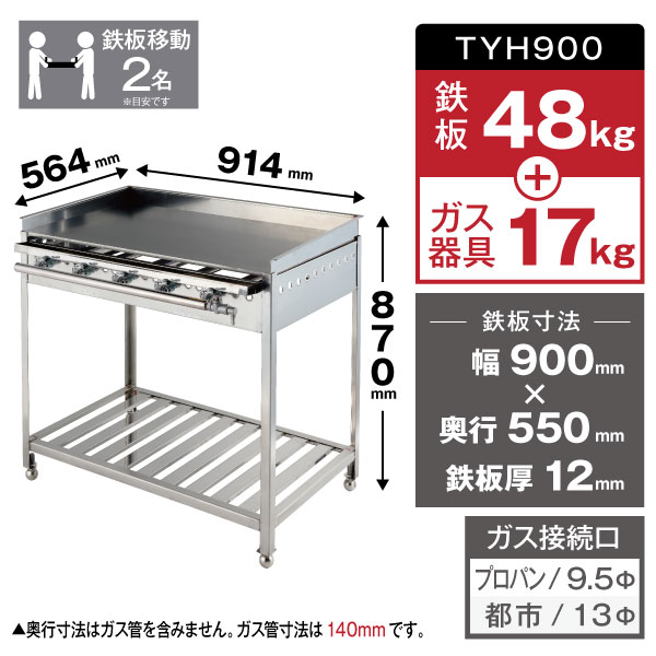 全国一律送料無料!!(北海道・沖縄・離島を除く) 【おまけ付き】 着火ライタープレゼント 鉄板厚も、お好み焼・焼そば・サイコロステーキなどにオールマィティーに対応できる12mmを使用しています。 抗菌ステンレスを使用しております。IKK製。 IKK業務用グリドル 高足 スタンダード TYH900 外形寸法 W914×D564×H870 鉄板寸法 W900×D550×H12 バーナー 5本 ガス消費量 プロパン/11.52kw 都市ガス/9,505kcal ガス接続口 プロパン/9.5Φ 都市ガス/13Φ 備考 奥行寸法はガス管を含みません。ガス管寸法は140です。