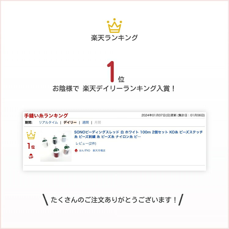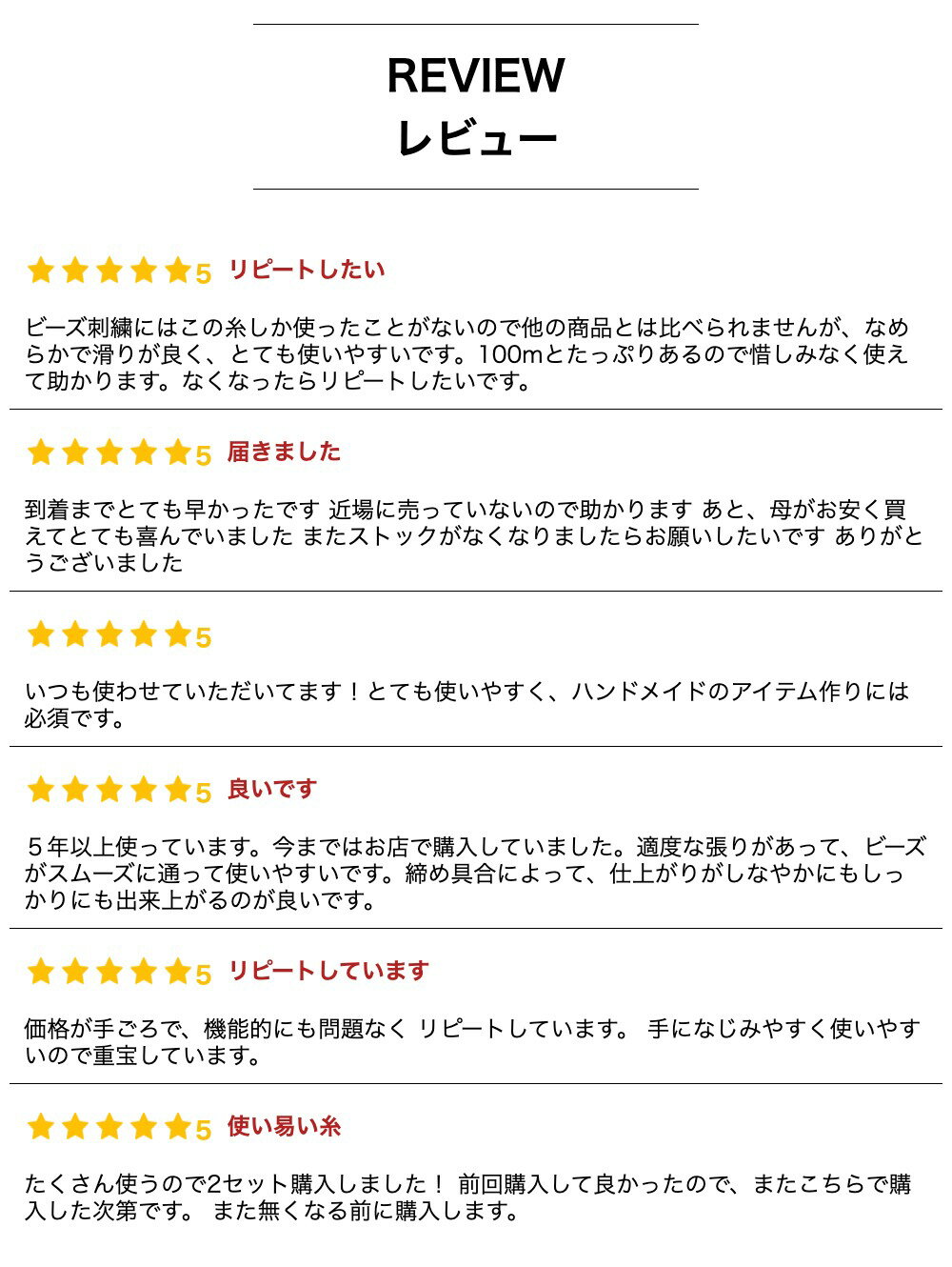 商品説明素材ナイロン100% サイズ100M巻 1個 or 2個 特徴 「滑らかで締まりが良い、日本発・最高級ビーズ用ナイロン糸」 ビーズステッチやビーズ刺繍、ビーズ織など様々なビーズワークに最適な日本で初めて開発されたナイロン芯のビーズ専用糸です。330dtexの程よい太さで細かい作業でも扱いやすく、繊細な作品が一段と美しく仕上がります。特殊なワックス加工が施されており、滑りがよく、糸通しもスムーズ。適度な伸縮性があるため結び目も締まりやすく、ほどけにくいのも特徴です。プロの作家さんはもちろん、ハンドメイド初心者の方にもおすすめしたい、ワンランク上のビーズクラフト用糸です。1個 or お得な2個セットです。 注意モニターの発色の具合によって実際のものと色が異なる場合がございます。 こんな方にお喜びいただいています ビーズ作家 ハンドメイド作家 手芸好き ビーズ好き 手芸部 おうち時間 ビーズデザイナー アクセサリー女子 ビーズ教室 こんな作品に使えます イヤリング ピアス ネックレス キーホルダー 指輪 ゆびわ アクセサリー ラップブレスレット リュネビル刺繍 髪飾り スマホストラップ ハンドストラップ キーストラップ ビーズ刺繍 ビーズステッチ ビーズ織 オートクチュールビーズ刺繍 ビーズアート ビーズクロッシェ スニーカーデコ スニーカーカスタム カスタムスニーカー関連商品ビーズステッチ糸 100m ビーズ刺繍糸 ビーズステッチ ビーズ糸 ナ...ビーズステッチ糸 30m ビーズ刺繍糸 ビーズステッチ 糸 ビーズ糸 ...お試し ビーズステッチ糸 10m カード巻 1枚 ビーズ糸 カード巻 ...440円320円154円【送料無料】1000円 ぽっきり3枚セット!ビーズステッチ糸 30m ...ファイヤーライン 4LB 6LB 50ヤード 45m 125ヤード 1...ファイヤーライン クリスタル 4LB 6LB 45m 50ヤード cr...1,000円1,540円1,540円KO300ビーズ糸 カード巻 8 or 10 or 12枚セット 全色...ビーズステッチ糸 業務用 300m ビーズ刺繍糸 ビーズステッチ 糸 ...WildFire ワイルドファイヤー 約45m 50ヤード 0.15m...2,400円2,030円1,870円ファイヤーライン クリスタル 6LB 125ヤード 約114m 白 大...両面 ベルベットリボン 6mm 9mm 12mm 24mm 36mm ...ダルマ 家庭糸 20番 30番 細口 太口 100m 200m 白 黒...3,850円480円143円