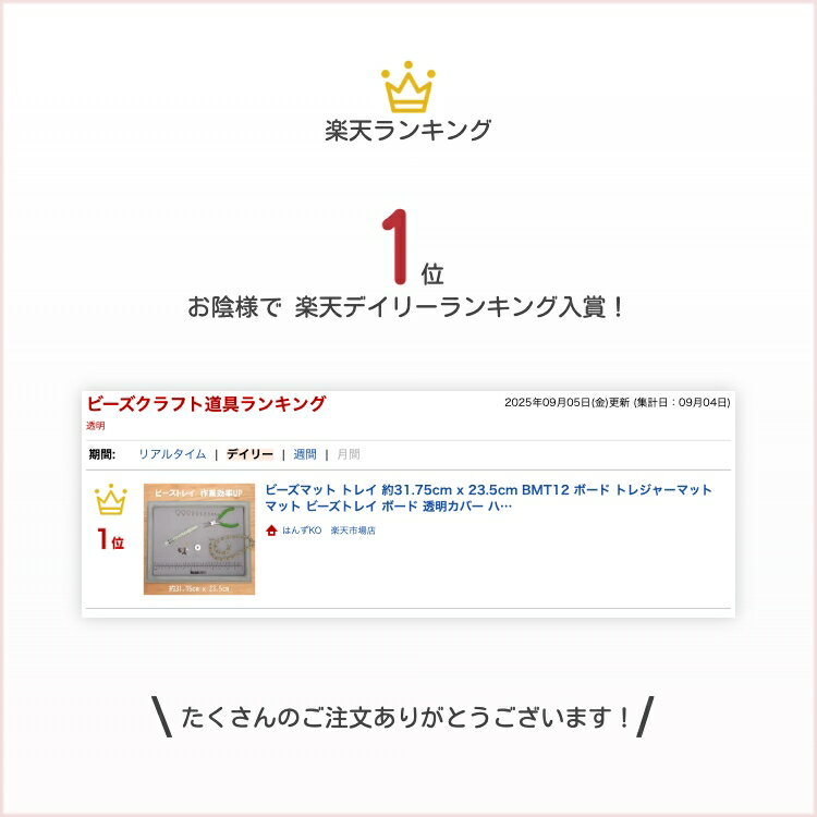 商品説明メーカー The Beadsmith サイズ 内寸:約31.75×23.5cm 外寸:約36×28cm 特徴 ◆ビーズが転がらないフロック加工のトレイ トレイはフロック加工されており、ビーズが滑りにくく作業効率が向上します。 ◆四方を囲んだ縁 制作作業中に転がり落ちるのを防ぎ、紛失防止に役立ちます。 ◆透明カバー付き&積み重ねて保管可能 透明カバーが付属し、作業中の作品を保護しながら持ち運びも簡単。複数のトレイを重ねて収納できます。 ◆広々とした内部スペース トレイ内は十分な広さがあり、複数のデザインを同時に制作したり修理するのに最適です。 ◆ギフトにも最適 プロから初心者まで幅広く使え、DIYアクセサリー制作を簡単に楽しめる便利なツールです。 注意 こちらの商品はトレイのみであり、マットは別売です。 モニターの発色の具合によって実際のものと色が異なる場合がございます。 海外製の為、製造時に発生する汚れが付着していたり、色ムラや傷がある場合がございます。 為替の変動等に伴い価格を変更させていただく場合がございます。 パッケージが変更する場合がございます。 関連商品ビーズ収納 ケース 1BOX 20個 小分けケース入り 小分け 保管 ...クロバー ビーズ刺し子テンプレート ビーズ刺し子 ビーズ 刺し子 テン...2way ビーズマット 約 35.5cm x 28cm ビーズ マット...1,480円1,408円792円デスクスレダー クイック ピンク グレー イエロー 簡単 糸通し 便利...クロバー カード型ビーズ織り機 58-621 ビーズ 織り 織機 織り...ビーズワッペン 専用両面 シール 8cm × 8cm 3枚入 ビーズパ...1,496円1,188円317円クロバー ビーズ織り機 58-631 ビーズ 織り 織機 織り機 ビー...ビーズスコップ 小 約5.5cmx2cm 大 約11cmx3.8cm ...三角ビーズ用トレイー アルミ製 ビーズ 色分け 補充 保管 ビーズワー...7,920円242円110円メッシュミニポーチ ビーズ糸収納 ビーズ糸 ケース 糸 収納 軽量 薄...ビーズマット 両面 ネイビー 紺 約10cmx10cm ビーズ 薄いビ...ビーズマット 両面 ベージュ 約 30cmx30cm ビーズ 転がらな...235円176円396円関連ワード: ビーズマット ビーズトレイ 約31.75cm 約23.5cm 手芸用トレイ ビーズアクセサリー用 アクセサリー制作ツール フロック加工 透明カバー 収納可能 広いスペース DIYアクセサリー工具 初心者向け 工具 作業効率 ネックレス ブレスレット 紛失防止 プレゼント ギフト 便利ツール ビーズマット ボード トレジャーマット ハンドメイド 手芸 クラフト 作業トレイ 作業マット アクセサリー 制作 便利 代用 介護 初心者 こぼれない おすすめ The Beadsmith
