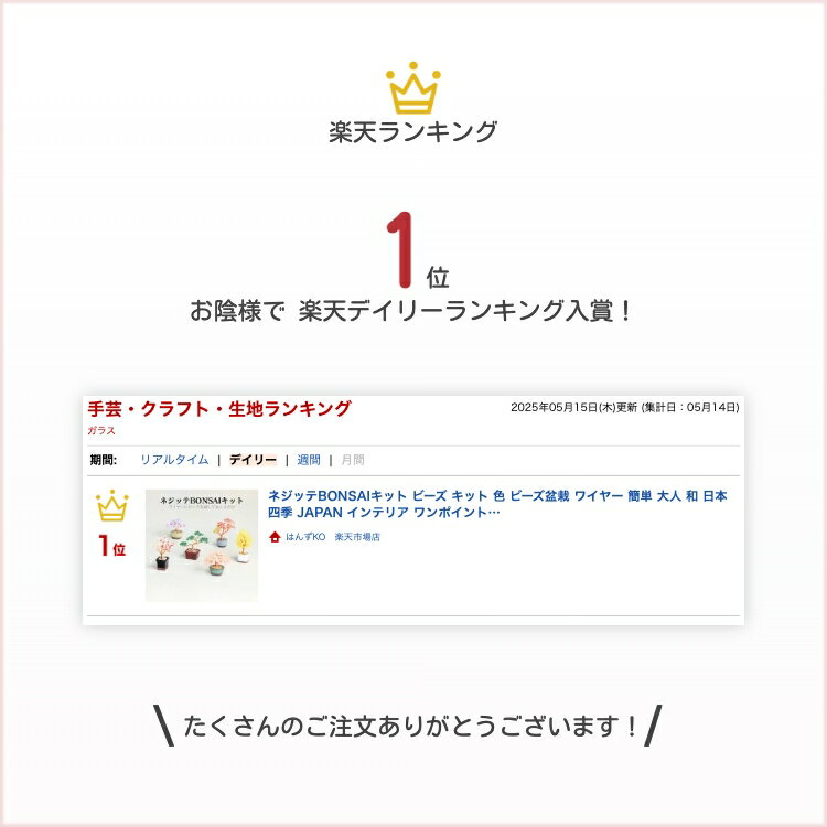 商品説明 セット内容 ビーズ、ワイヤー、粘土、砂利、鉢、説明書 サイズ 本体(約):タテ約6.5 〜9.5cm ×ヨコ約5〜7.5cm 特徴 ビーズを通したワイヤーをねじって、小さな盆栽をつくるキット。枝や葉を自在に動かせるので、本物の盆栽のように好みの樹形に仕立てることができます。ねじったワイヤーの動きが、まるで本物の幹のよう。指先でつまめるサイズで、ずらりと並べて飾るのにもよさそうです。 つくりかたは、ワイヤーにビーズを通してねじるだけ。土台となる鉢や砂利なども、すべてセットになっているため、ハサミとものさしがあればつくることができます。 四季を感じる6種類の樹から選ぶことができます。 注意 モニターの発色の具合によって実際のものと色が異なる場合がございます。 製造ロットにより、カラー・サイズに若干の差異が生じることがありますのでご了承ください。 関連商品めざましテレビ めざましTV ビーズ 刺しゅうキット ブローチ ビーズ...めざましテレビ めざましTV はらぺこ ブローチ キット ビーズ 刺し...ビーズ刺しゅうキット beads de OHANASHI ビーズ 刺し...2,100円1,944円2,860円ビーズ刺しゅうキット TORI brooch ビーズ 刺しゅうキット ...ビーズリング キット 指輪 約8〜10個つくれる 人気 リング ビーズ...帽子ホルダーキット ビーズ キット 帽子 ホルダー ビーズキット アク...1,980円990円2,180円こんぺいとう ネックレスキット 長さ 約42cm 調整可能 ネックレス...あわのわ ビーズアクセサリーキット イヤリング 5色 泡の輪 ビーズ ...お花刺しゅうブローチ ビーズ 刺しゅうキット ブローチ 刺繍 刺しゅう...1,300円2,100円1,320円送料無料 オーロラガラスアクセサリー キット ブレスレット イヤリング...ゲッコのフラワーネックレス ビーズ ネックレスキット ネックレス ビ...nuie ヌイエ 描くように 縫う 刺しゅうキット 刺繍 刺しゅう ビ...1,100円5,720円2,574円関連ワード: ネジッテBONSAIキット ビーズ キット 色 盆栽 ぼんさい ワイヤー 簡単 大人 和 日本 四季 JAPAN インテリア ワンポイント アクセサリー かわいい 手芸キット ハンドメイド ものづくり プレゼント お土産 日本製 オリジナル MIYUKI HCA30 クラフト 小型 6種 セット内容 土台 植物 和風 ミニチュア 手軽 デコレーション インドア アート ディスプレイ 手作りDIY 自由アレンジ ギフトアイディア 観賞用 四季折々 手作り ギフト