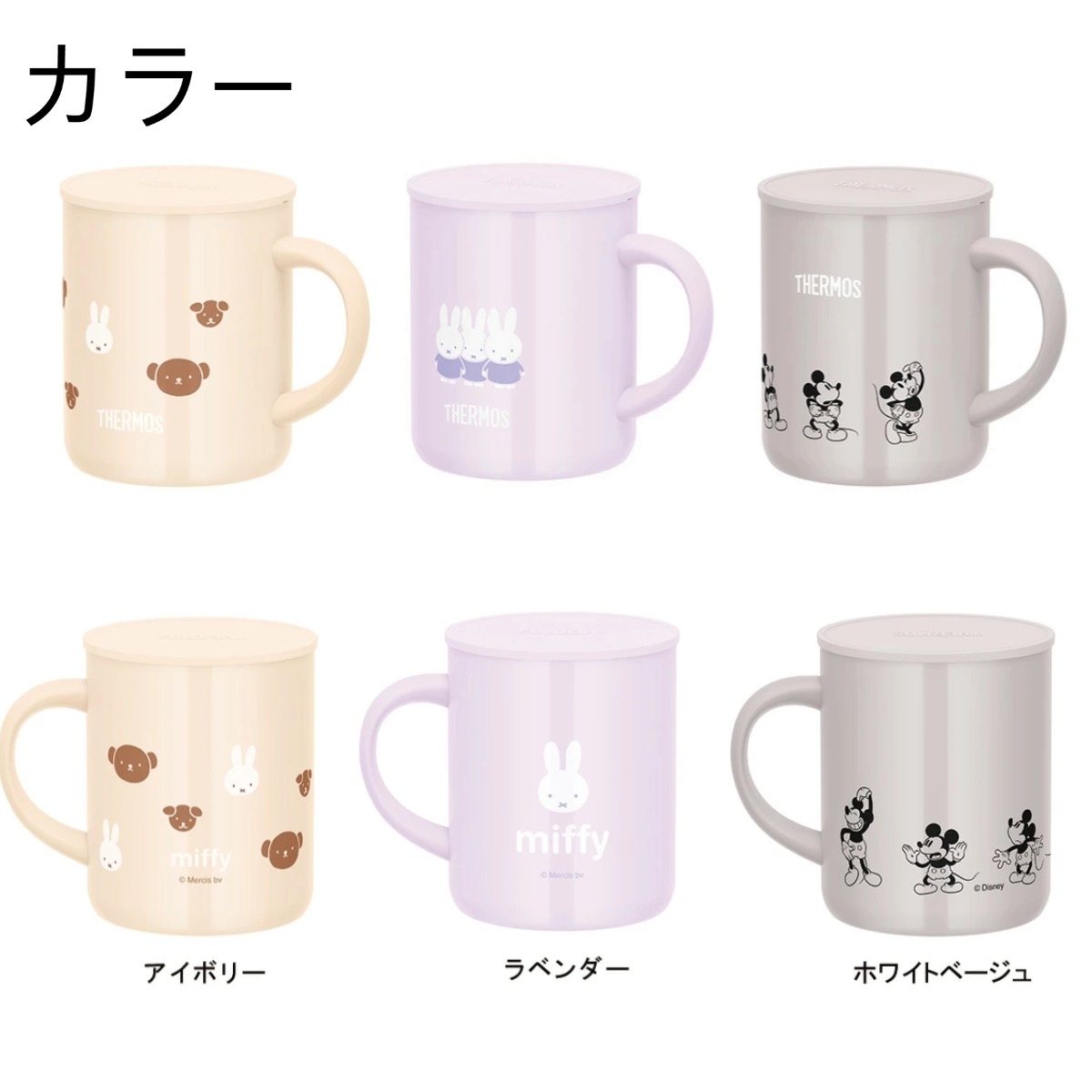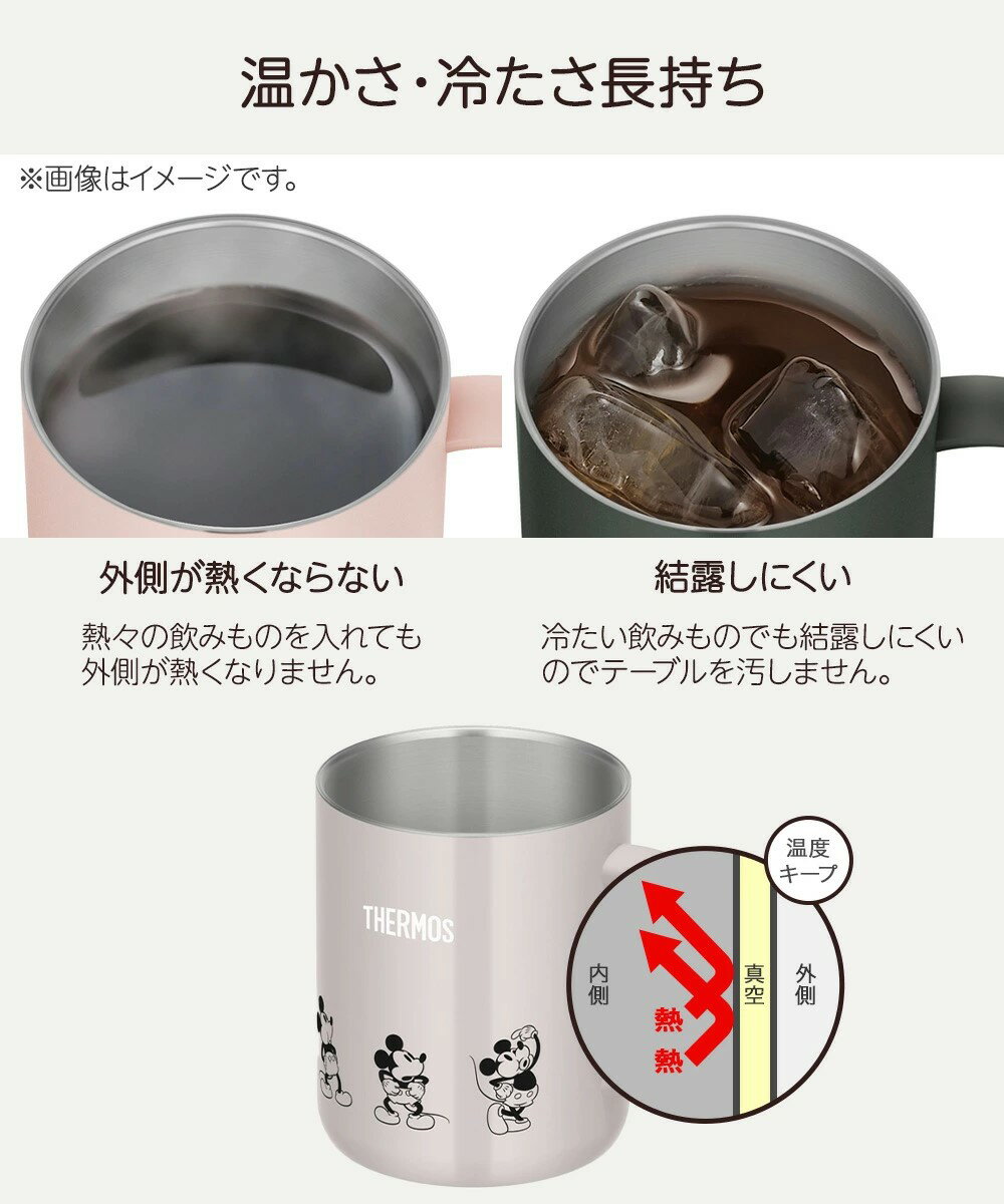 商品情報商品名JDG-351B・JDG-351DSカラーラベンダー(ミッフィー)アイボリー(くまのボリス)ホワイトベージュ(ミッキー) 容量350ml質量(約)200gサイズ 幅×奥行×高さ(約cm)/11.0×8.0×10.0 cm 保温効力(1時間) 67℃以上 保冷効力(1時間)8度以下 素材・材質:内びん本体:ステンレス鋼(アクリル樹脂塗装) ハンドル:ABS樹脂 フタ:ポリプロピレン商品概要 ●氷を入れても結露しにくい: 真空断熱構造により、氷を入れても結露しにくく、テーブルを汚さないので安心して使えます。特に夏場には冷たい飲み物が長時間冷えたままで楽しめます。 ●外側が熱くならない: 熱々の飲み物を入れても、マグカップの外側が熱くならないので、安心して持つことができます。小さなお子様にも安心です。 ●ステンレス製魔法びん構造: サーモスならではの真空断熱構造が、飲み頃の温度をしっかりキープ。保温・保冷両方に対応しているので、季節を問わず使える万能マグカップです。 ●丸みを帯びた口当たりの良い飲み口: 飲み口は丸みを帯びたデザインで、口当たりがよく、飲み物をさらに美味しく感じられます。毎日のティータイムが楽しみになる一品です。 ●ほこりを防ぎ保温に効果的なフタ付き: 付属のフタは、ほこりを防ぐだけでなく、保温効果も高めます。使わないときでも衛生的に保管できるので便利です。【送料無料】サーモス 蓋つき マグカップ コーヒーセット JDG-351B JDG-351DS 保温 保冷 真空断熱マグカップ JDG-351 350ml ステンレス 取っ手付き カップ コップ タンブラープレゼント おしゃれ マーク 部活 ギフト 贈り物 ミッフィーやくまのボリス、犬のスナッフィーがデザインされた、かわいくて機能的なサーモスのマグカップ! 6