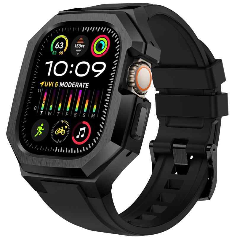 OOULOVE コンパチブル アップルウォッチ バンド 44mm 45mm 49mm ステンレス鋼 ケース付き 頑丈なメンズ フッ素ゴムベルド 一体型 スポーツバンド Apple Watch バンド Series 9/8/7 45mm SE2/6/5/4