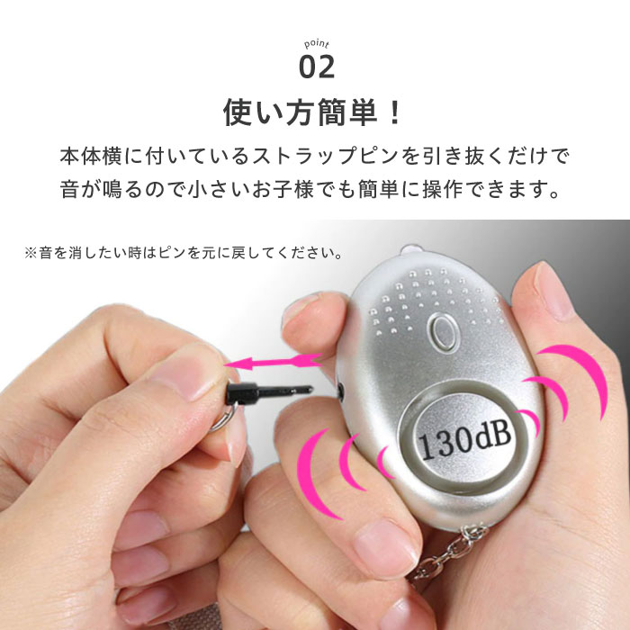 商品説明 耳を塞ぎたくなるほど我慢できない騒音レベルの130dB!離れた位置からでもはっきり聞こえます。 本体横に付いているストラップピンを引き抜くだけで音が鳴るので小さいお子様でも簡単に操作できます。音を消したい時はピンを元に戻してください。 丸みのあるデザインでサイズも小さくとても軽いので持ち歩けます。 キーリング付きなのでカバンやランドセルに取り付けれます。 LEDライト付きなのでボタンを押すと暗い夜道を照らしてくれます。 お好みのカラーが選べる7色選べます。 注意事項 ・騒音レベルの大音量の為、テスト使用の際は周りにお気をつけください。 ・耳のそばでブザーを鳴らさないでください。耳を痛める原因となります。 ・本製品は防水・防雨構造ではありませんので水などに濡れると故障する場合があります。 ・音を消したい時はピンを元に戻してください。 ・こちらは海外輸入品です。箱や説明書は付属しておりません。 ・簡易検品はしておりますが、製造時にできた傷や、汚れ、ほつれがある場合があります。 ・商品のお色は撮影時の環境、ディスプレイの発色などにより実物と多少の違いが生じることがございます。 ・製品アップデートにより、細部の仕様、若干の色味等が予告なしに変更する場合がございます。 ・商品サイズや重量は、当店スタッフが計測しておりますが、測り方やロット等により、多少の誤差が生じる場合がございます。