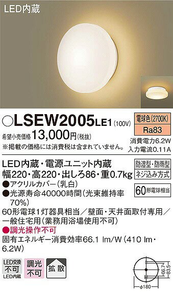 ●全光束:410lm●電圧:100V●消費電力:6.2W●消費効率:66.1lm/W●【アクリルカバー】乳白●Ra83●60形電球1灯相当●壁面・天井面取付専用●一般住宅用(業務用浴場使用不可)●入力電流(100V時):0.11 A●調光操作不可返品・交換について「返品区分A」:「未開封・未使用」「商品到着後1週間以内」「返品手数料商品代金の50%以上」の条件にて返品可能⇒詳細はこちらをクリック※返品送料は全てお客様負担とさせて頂きます。※当店ではお客様都合による交換は受け付けておりません。メーカー/品番パナソニック LSEW2005LE1商品カテゴリ照明器具 浴室灯 LED取付方法取付・電気工事が必要です。本体サイズ幅220・高220・出しろ86 重0.7kg商品説明ランプ色: LED(電球色)主な仕様: パナソニック 防雨・防湿型【検索用コード】 【R送料無料_パナLS】■検索コード 20151126■ジャンル インテリア・寝具・収納 ライト・照明器具 天井照明 浴室照明■カテゴリ 照明器具 浴室灯 LEDその他注意事項※本商品は、メーカー取り寄せのため、欠品している場合がございます。※画像はイメージです。商品の詳細はメーカー受付窓口/HPにてご確認ください。※掲載商品は予告無く販売終了となっている場合もあり、掲載商品全ての出荷確約をするものではありません。パナソニック 浴室灯LSEW2005LE1