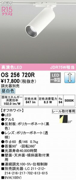 オーデリック レール用スポットライト ホワイト LED 昼白色 調光 OS256720R
