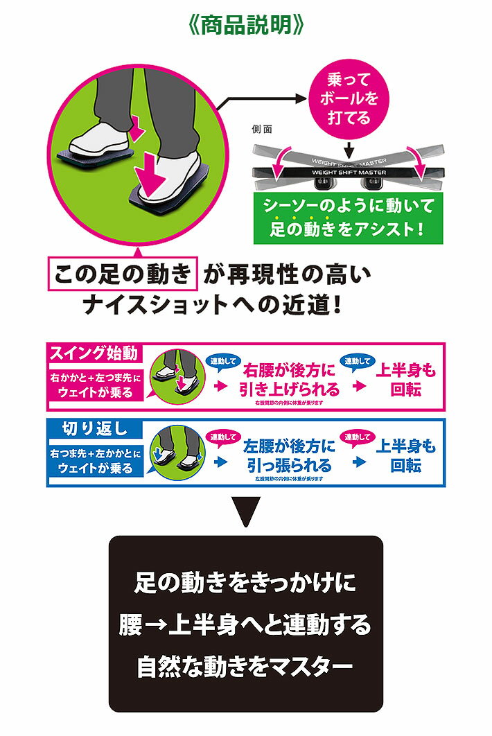 Tabata Golf WEIGHT SHIFT MASTER GV0377 タバタゴルフ ウェイトシフトマスター 下半身主導の安定スイングで脱・手打ち! 足の動きをきっかけに腰~上半身へと連動する自然な動きをマスター 《商品説明》 【特 徴】 ■裏面のパーツ幅を変えることで前後への倒れやすさを調整 できます。 ■1本足にして、より体重移動を実感できる練習もできます! ■パーツを付け替えてさまざまな練習が可能。悩みに合わせた セッティングでスコアアップ! ■スウェー防止や傾斜を想定した練習も可能です。 【仕 様】 ■パッケージサイズ:高さ178×幅323×奥行85(mm) ■サイズ・重量: ・本体サイズ(片足分):300×168×50(mm) ・本体重量(両足分/2個):980(g) ■素 材:材質:ABS、ラバー ■JAN:4983608517452 ※モニターの発色の具合によって実際のものと色が異なる 場合がございます。 ※メーカーお取り寄せ商品になります。 メーカーの生産状況により、入荷が遅れる可能性がございます。予めご了承下さい。 クリスマス バレンタイン プレゼント お正月 お歳暮 誕生日 お中元 記念日 入学 卒業 祝い 内祝い 就職 こどもの日 ボーナス 景品 父の日 母の日 敬老の日 アウトドア スポーツ用品