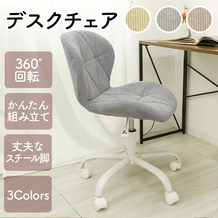 さらっと、なめらかな手触りが気持ちいいコーデュロイ素材。 インテリアに調和しやすい、くすみカラーがおしゃれなデスクチェアです。 優しいカーブデザインが身体にフィットし、包み込まれるような座り心地です。 ホワイトカラーの丈夫なスチール脚、温かみが感じられるシンプルなデザインで、インテリアにもなじみます。 背もたれは、高さ約30cmとコンパクトで軽量。 すっきりした印象で圧迫感もありません。 座面高は、約43〜53cmまで調節可能なので、大人から子供まで幅広くご愛用いただけます。 360度回転&便利なキャスター付きで、移動もラクラク。 ひじ掛けなしで、デスクにもスッキリ収納できます。 オフィスチェアやワーキングチェアとして 学習用チェア、待合室用の椅子など 幅広く使用できる椅子です。 商 品 詳 細 内容 本体×1 カラー ミルキーベージュグレージュアイスグレー サイズ 全体:約幅55×奥行55×高さ73〜83cm 座面サイズ 約幅50×高さ33cm 耐荷重 約120kg 素材 コーデュロイ素材、スチール キャスター材質:PU(ポリウレタン) 保証期間 30日間 ※商品到着後30日以内の初期不良・破損のみご対応させていただきます。 注意事項 ・組立て後、脚にガタツキが生じた場合は通常使用している間に馴染んでいきますので、ご安心下さい。 ・座面のカバーは取り外しできません。背面のファスナーは、縫製時の仕様のため開閉しないでください。 ・商品は、モニターによって色合いが異なって見える場合があります。 ・仕様・デザインは改良のため予告なく変更することがあります。 配送について 送料 無料 ※北海道・沖縄・離島等、一部地域は別途中途料がかかります。 備考 ・配達地域や交通事情等により、希望配達日時にお届けできない場合がございます。あらかじめご了承ください。 ▼検索キーワード デスクチェア チェア イス 椅子 腰痛 腰掛 ダイニングチェア カウンターチェア オフィスチェア パソコンデスク ダイニング おしゃれ 北欧 コーデュロイ カラー 血色カラー ニュアンスカラー 可愛い デザイナーズ シェルチェア デザイナーズチェア 可愛い 女性向けデスクチェア ベロア キャスター付き椅子 回転式 白脚 女子向けデスクチェア 疲れない オシャレ ファブリック 在宅ワークチェア リモートワーク 椅子 パソコンチェア おしゃれ かわいい 疲れにくい 子供 コンパクト クラシック レトロなデスクチェア オフィス 昇降 回転 キャスター 事務椅子 オフィスチェアー パソコンチェアー デスクチェアー PCチェア デスク チェア 椅子 イス くすみカラー ベージュ アイボリー グレー 敬老の日 母の日 父の日 ギフト 誕生日 プレゼント 父の日ギフト 誕生日プレゼント 結婚祝い 福袋 メンズ レディース 男性 女性 あす楽 通販 人気 おすすめ 送料無料 安い 激安 セール 通販 楽天 クラソート Classort WEIMALL Classort楽天市場店▼キズ・汚れ防止・防音対策に▼ ▼おすすめ商品▼ ふっかふか高反発×低反発クッション イームズチェアクリア イームズチェアDSW ワークデスク