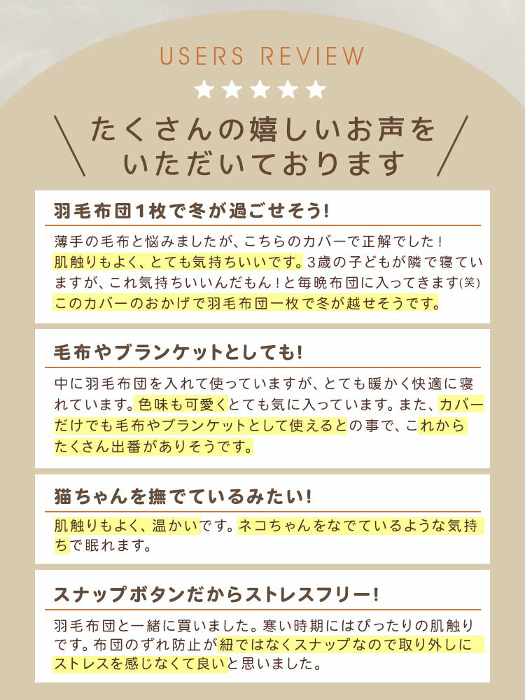 【毛布にもなるふんわり掛け布団カバー】 \おすすめポイント/ ◆とろける肌ざわりと抜群の保温力 まるで毛布のように“ふわふわ・とろとろ”の肌ざわり。 マイクロファイバーが体温を逃さずキープ。 寒い冬の夜も、布団の中はぽかぽか快適♪ ◆毛布としても大活躍 布団を入れずにカバーだけで使えば、ふんわり毛布に早変わり! 肌寒い季節のひざ掛けや昼寝にもぴったり。 掛け布団だけでなく、電気毛布を入れて毛布カバーとしても◎ ロングシーズン使用できます♪ ◆静電気防止素材でパチッとしない 乾燥しがちな冬でも、パチパチしにくい静電気防止加工で安心。 ◆使いやすい工夫がいっぱい 全開ファスナーで布団の出し入れラクラク。 さらにズレ防止スナップ付きで快適に使用できます。 ◆いつでも清潔 洗濯機で丸洗い可能だから、毎日気持ちよく清潔に使えます。 速乾でお手入れラクラク! ◆安心のエコテックス認証&低ホルム 世界最高水準の安全な繊維製品の証「エコテックス スタンダード100」ラベルを取得。 低ホルム仕様で、小さなお子様やお肌が敏感な方も安心してお使いいただけます。 商 品 詳 細 カラー 新色*ネイビー 新色*アッシュブラウン 新色*サクラスモーク グレー ミルクティー ミルキーホワイト サイズ シングル:約横幅150×縦幅210cm セミダブル:約横幅170×縦幅210cm ダブル:約横幅190×縦幅210cm 素材 マイクロファイバー 保証期間 30日間 ※商品到着後30日以内の初期不良・破損のみご対応させていただきます。 注意事項 ・掛け布団本体は付属しておりません。 ・製品の特性上、ご使用中や洗濯中に毛羽立つことががりますが、機能的に問題はございません。 ・商品は、モニターによって色合いが異なって見える場合があります。 ・仕様・デザインは改良のため予告なく変更することがあります。 配送について 送料 無料 ※北海道・沖縄・離島等、一部地域は別途中途料がかかります。 備考 ・配達地域や交通事情等により、希望配達日時にお届けできない場合がございます。あらかじめご了承ください。 ▼検索ワード 掛け布団カバー あったか 布団カバー 掛布団カバー かけ布団カバー 掛けふとんカバー かけふとんカバー 布団カバー 暖かい掛け布団カバー 毛布のいらないカバー 毛布いらず 毛布にもなるカバー 毛布になる掛け布団カバー 布団 が 入れ られる 毛布 ずれない 毛布 カバー 暖かい 暖か あたたかい あったかい あったか 極暖 無地 かわいい 可愛い 北欧 おしゃれ 冬用 ボア マイクロファイバー 掛けカバー 暖かい 羽毛布団カバー 羽毛掛け布団カバー シングルロング シングル ロング セミダブルロング セミダブル ロング ダブルロング ダブル ロング シングルサイズ セミダブルサイズ ダブルサイズ グレー ミルキーホワイト ミルキーベージュ ブラウン ベージュ ホワイト 白 冬用 可愛い 秋冬 柄 大人 子供 キッズ 起毛 ふわふわ ぬくぬく 肌触り最高 気持ちいい 柔らかい 柔らか やわらか なめらか 洗える 洗濯 できるフランネル 丸洗い 低ホルムアルデヒド 静電気防止 防寒 8ヶ所スナップボタン付き FEL001布団カバーのみ 洗濯機 丸洗い 洗濯ネット 静電気 防止 静電気防止 掛け布団カバー あったかグッズ あったか寝具 おすすめ 送料無料 安い 激安 セール 通販 楽天 クラソート Classort WEIMALL Classort楽天市場店こちらをタップして詳しくチェック♪ \マイクロファイバーシリーズ/ ▼ ボックスシーツ ▼ ▼ 枕カバー ▼ \2025新商品/ あったか、ふわとろ♪病みつきの手触り♪▼ もこもこ2枚合わせ毛布 ▼ 表はふわふわラビットファー裏は滑らかで保温力抜群マイクロファイバー置くだけでおしゃれな空間に♪ \届いてすぐ使える/ ▼ 布団5〜6点セット ▼ \セットで使うと暖かさアップ/ あったか、なめらかシルキータッチ▼ 吸湿発熱 3層2枚合わせ毛布 ▼ 吸湿発熱&2枚合わせで保温力抜群!抗菌防臭|洗濯機で洗える|静電気防止S|SD|D あったか、なめらかシルキータッチ▼ 吸湿発熱 敷きパッド ▼ 吸湿発熱で保温力抜群!抗菌防臭|洗濯機で洗える|静電気防止S|SD|D 耳までスッポリ!ぽっかぽか♪▼フード付き着る毛布▼ 足元スッキリ!低身長さんやお子様にもうれしい♪ショート丈が新登場!着る毛布|3サイズ 季節外の寝具や衣類の収納におすすめ クッションになる布団収納ケース幅60×奥行60×高さ20cm クッションになる布団収納ケース幅60×奥行24×高さ48cm ▼ あったかアイテム特集はこちら ▼ ▼一緒にご購入している関連品▼ >届いてすぐ使える!布団7〜9点セット >掛け布団 >毛布・ブランケット >マットレス >ヒーター・加湿器
