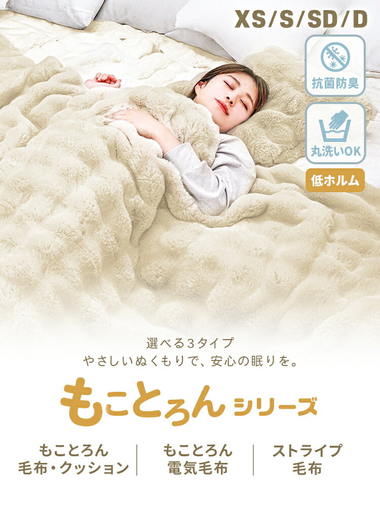とろける肌触りが大人気のもことろん毛布に【電気毛布】が新登場! ふわとろ、もこもこ、なめらかでやみつきになる手触り♪ 2枚合わせで保温力抜群!まるでうさぎ!?のふわとろ毛布 ブランケットやひざ掛けとしてはもちろん ソファーカバーやベッドカバーとしてもオススメ! インテリアとしても映えるので、置くだけでおしゃれな空間に♪ ◆かわいい×実用性 2枚合わせでぽかぽか暖かい! 表はふんわり柔らかいラビットファー風生地 裏は滑らかで保温性の高いマイクロファイバー 2枚の生地の間にできた空気の層で保温性がグンとUP! 電気毛布は、AI搭載の温度調節機能により、 体温や室温に合わせて自動で最適な暖かさをキープしてくれます。 ◆シーンで選べる4サイズ XS:ひざ掛けや持ち運びに最適 S:一般的な1人用サイズ SD:ゆったり1人用、2人でも使えるサイズ D:ゆったり2人用、ソファーカバーなどにも使えるサイズ ◆安心して使える低ホルム 肌に直接触れるものだから品質にもこだわりました。 家族みんなで安心してお使いいただけます。 ◆お手入れ・収納ラクラク! 洗濯OK!いつでも清潔を保てます! 嬉しい収納袋付き!使わないときはコンパクトに収納できます♪ ◆マルチに使えるブランケット ひざ掛け、ソファカバー、布団カバーなどマルチに使えるスグレモノ! お昼寝用毛布 や 敷き毛布 として使ったり… 寒い時期もほっこり、あたたかく過ごせます。 ふんわり、やわらかく、なめらか 肌触り の いい 毛布 で心地よい眠りを。 商 品 詳 細 内容 本体 ×1 収納ケース ×1 コントローラー×1(電気毛布のみ) カラー カフェオレブラウン モカグレージュ ライトグレー グレー ミルキーホワイト ミルキーベージュ ブラウン サイズ XS:約幅100×長さ160cm S:約幅140×長さ200cm SD:約幅160×長さ200cm D :約幅180×長さ200cm 46×46cm(クッションカバー):45×45cm 重量 【ポコポコ毛布】 XS:約1.6kg S:約2.6kg SD:約3kg D :約3.5kg 46×46cm(クッションカバー):約300g 【ストライプ毛布】 XS:約1.1kg S:約2.0kg SD:約2.6kg D :約2.9kg 電気毛布機能 AI搭載温度調整 6段階温度調節(25〜55℃) 5段階タイマー機能(1・2・3・4・8時間) 過熱時自動OFF機能 チャイルドロック PSE認証済み 素材 表生地:ラビットファー風生地(ポリエステル100%) 裏生地:マイクロファイバー 保証期間 30日間 ※商品到着後30日以内の初期不良・破損のみご対応させていただきます。 注意事項 ・開封の際は、はさみやカッターなどで中の製品を傷つけないようご注意ください。 ・お届け後は、お洗濯してからご使用ください。 ・製品の特性上、ご使用中や洗濯中に毛羽立つことがありますが、機能的に問題はございません。 ・圧縮梱包により、表面のもこもこ模様や、マイクロファイバー面に潰れやシワが目立つ場合がございますが、数日広げていただくか、一度お洗濯いただくと自然に軽減されます。 ・商品は、モニターによって色合いが異なって見える場合があります。 ・仕様・デザインは改良のため予告なく変更することがあります。 配送について 送料 無料 ※北海道・沖縄・離島等、一部地域は別途中途料がかかります。 備考 ・配達地域や交通事情等により、希望配達日時にお届けできない場合がございます。あらかじめご了承ください。 ▼検索ワード 毛布 もうふ ふわとろ毛布 とろふわ毛布 もこもこ毛布 もこもこブランケット モコモコブランケット ふわふわ毛布 ポコポコ毛布 掛布団カバー 布団カバー マイクロファイバー 毛布 マイヤー毛布 掛け毛布 掛毛布 掛け布団 肌掛け 肌掛 肌掛け毛布 ひざ掛け ふわふわブランケット ブランケット ひざ掛け ひざかけ 毛布 2枚合わせ 二枚合わせ 二 枚 合わせ 毛布 厚手 3層 三層 足 全身 すっぽり とろけるタッチの布団を包める毛布 (配送について) 人気 おすすめ 売れ筋 再入荷 送料無料 最短 すぐ発送 在庫あり 即日発送 (素材) ラビットファー マイクロファイバー フランネル ポリエステル (カラー) グレー ミルキーホワイト ミルキーベージュ ブラウン ベージュ ホワイト 白 (サイズ) シングル シングルサイズ セミダブル ダブル ハーフ ロングサイズ 140×200 160×200 180×200 100×160 大きい 小さい 小さめ (こんなシーズンで活躍) 秋 冬 秋冬 秋用 冬用 一人暮らし 新生活 引越し 引っ越し 来客 来客用 (こんな毛布) 軽い 軽量 暖か 暖かい あったかい あったか 極暖 おしゃれ オシャレ かわいい 可愛い ラグジュアリー 厚手 大判 肌触り最高 気持ちいい 柔らかい 柔らか やわらか もこもこ モコモコ ぽこぽこ ポコポコ ふわふわ ふんわり ふわもこ もふもふ もちもち なめらか とろける とろとろ とろふわ とろ りケット 洗える 洗濯 できる 洗濯機 丸洗い 洗濯ネット 静電気 防止 静電気防止 衿 くり お 昼寝 毛布 保育園 妊娠 マタニティ プレゼント あったかグッズ あったか寝具 ソファー ソファー 用 オフィス リビング キャンプ アウトドア 機内 車用 ベビーカー 防寒 防風 もちまる 毛布 猫 ヒーター 北欧 無地 人気 ベビー 温活 リラクゼーション 冷える 冷え 手足 婦人 