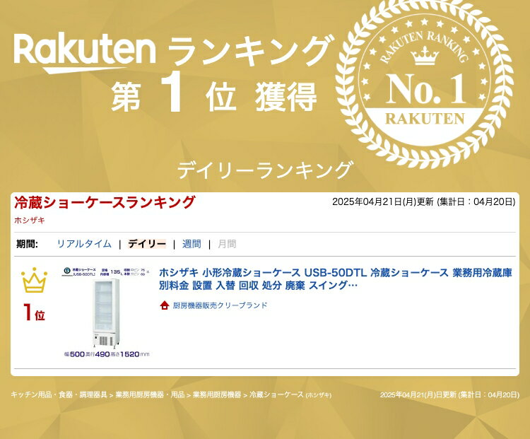 製品スペック メーカー型番 ホシザキ USB-50DTL 外形寸法 幅500×奥行490×高さ1520mm 定格内容積 135L 収納本数 ※中ビン約75本,大ビン約69本※瓶の大きさで異なります。(目安) 庫内温度 2〜12℃ ※(周囲温度30℃) 外装 カラー鋼板(オフホワイト),亜鉛鋼板(後板) 扉 複層ガラス1枚 内装 ABS樹脂 断熱材 硬質ポリウレタン一体発泡 電源 単相100V 50/60Hz 容量 0.49kVA(4.9A) 消費電力 冷却時 140/150W霜取時 23/23W 年間消費電力 450kWh/年 (JIS B8631-2 2011年基準) 2020年省エネ基準達成率 120% 環境影響度の目標値 ※GWP150,目標年度2029年※地球温暖化係数 電源コード 2.8m (L形プラグ付) 冷媒 R134a 棚網 棚網3枚※棚網追加は有料オプション 付属品 ドレンパン 製品質量 54kg(梱包時約57kg) ホシザキの小形冷蔵ショーケース「USB-50DTL」は、幅500mm×奥行490mm×高さ1520mmのスリム&ハイタイプ設計で、省スペース店舗にも設置しやすいモデルです。庫内温度は2〜12℃に設定可能で、飲料やデザートの陳列に最適。前面は視認性に優れたロングスイングガラス扉を採用し、在庫確認や取り出しがスムーズです。庫内は樹脂製で棚は51.5mm間隔で高さ調整可能。マイコン制御により、温度は1℃単位で正確に管理されます。除霜水は強制蒸発方式で、排水処理の手間も軽減。中瓶75本、大瓶69本を収納でき、キャスター付きで移動も簡単です。冷却時の消費電力は約140/150W、霜取時は23W。135Lの実用容量で、信頼性と実用性を兼ね備えた一台です。 メーカー希望小売価格はメーカーカタログに基づいて掲載しています■搬入/設置/入替工事等(※別料金)をご希望の場合はお問合せください。 ・不要の場合:車上渡し便でのお届けとなります。 ・設置等希望の場合:【別料金】となりますのでお見積り致します。■日中連絡のつく電話番号をご登録ください。 「冷蔵ショーケースの調子が悪くて、商品が売れない…」 「見た目が古くてお客様の目を引かない…」 そんな現場の声を何百と聞いてきた私たちが、 自信を持っておすすめするのが、 ホシザキ製の業務用冷蔵ショーケースです。 🏆【国内シェアNo.1の信頼と実績】 全国の飲食店・ホテル・医療施設など、 プロの現場で圧倒的に選ばれ続ける 冷蔵機器ブランド「ホシザキ」。 🔧【安心の全国サポート体制】 トラブル時も全国サポート網で対応。 “冷えない=販売できない”リスクを最小限に抑える、 圧倒的アフターサービスが最大の強みです。 📈【高い冷却力と省エネ設計】 温度ムラを抑える冷却力。 電気代も抑えられる省エネ性能で、 日々の運用コストにもやさしい仕様です。 【正規販売代理店の当店だからこそ】 ・メーカー保証対応OK(※保証期間・適応外は有料) ・型番に応じた設置・納期のご相談も可能 ・多数の導入実績とノウハウあり 【忙しい店舗にこそ、ホシザキの冷蔵ショーケース】 “見せて売る” を支える確かな性能。 安心の1台を正規ルートでお届けします。