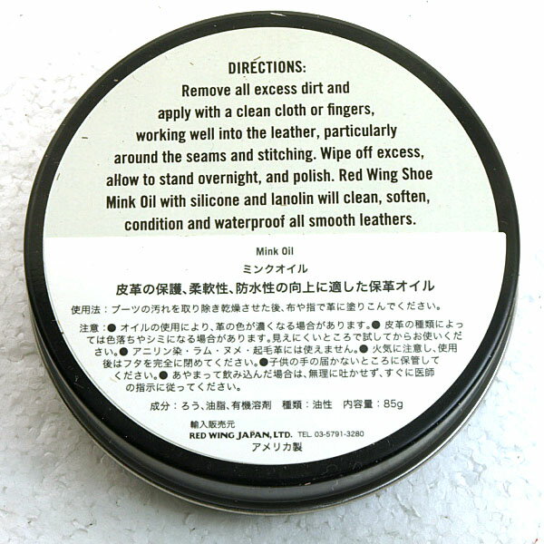 ■商品概要■RED WING MINK OIL レッドウィング ミンクオイル 97105 純正アクセサリー成分:ろう、油脂、有機溶剤 内容量:85g ■商品説明■クリーム1個のお値段です。レザーにオイル分を補給し、そのしなやかさを保つための保革オイルです。靴に塗りやすいペースト状です。シリコン、ラノリンが配合されており、耐水性を高める効果もあります。 ■ご使用方法■ブラシなどで靴の汚れを取り除き、布や指で革に塗りこんでください。オイルドレザーや濃い色の革に適しています。 靴のレザーが濡れていたり湿っていたりする場合は、しっかり乾かしてから、塗布してください。 ※ご注意※・オイルの使用により、革の色が濃くなる場合があります。・アニリン染・ラム・ヌメ・起毛革、その他特殊な革には適しません。 ・皮革の種類によっては色落ちやシミになる場合があります。 目立たないところで試してからご使用ください。 ■RED WING一覧 ■シューケア・アクセサリ一覧