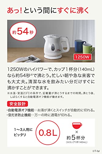 商品情報商品の説明説明 倒れても、湯こぼれしにくい「転倒お湯もれロック」タイプ Ag+(銀イオン)を練り込んだ抗菌素材「マイクロバン」使用 水あか発生を防ぐ「ウルトラポリッシュ底面」 給水しやすく、中も洗いやすい「取り外しできるフタ」 注ぎ口が汚れにくい「ほこりよけ形状」 0.1L単位で正確に測れる「目盛り付き窓」 空焚き防止機能 & 自動電源OFF機能主な仕様 サイズ:幅21.9×奥行18.5×高さ15.3cm、コード長さ/1.3mbr素材・材質:本体・ハンドル・ふた・電源スイッチ・目盛り付き窓・電源プレート・注ぎ口カバー/ポリプロピレン、内側底面/ステンレス、電源コード/クロロスホン化ポリエチレンゴムbr電源:100V 50-60Hzbr定格消費電力:1250Wbr保証期間:1年間br生産国:中国br容量:0.8Lbr本体重量(kg):0.944