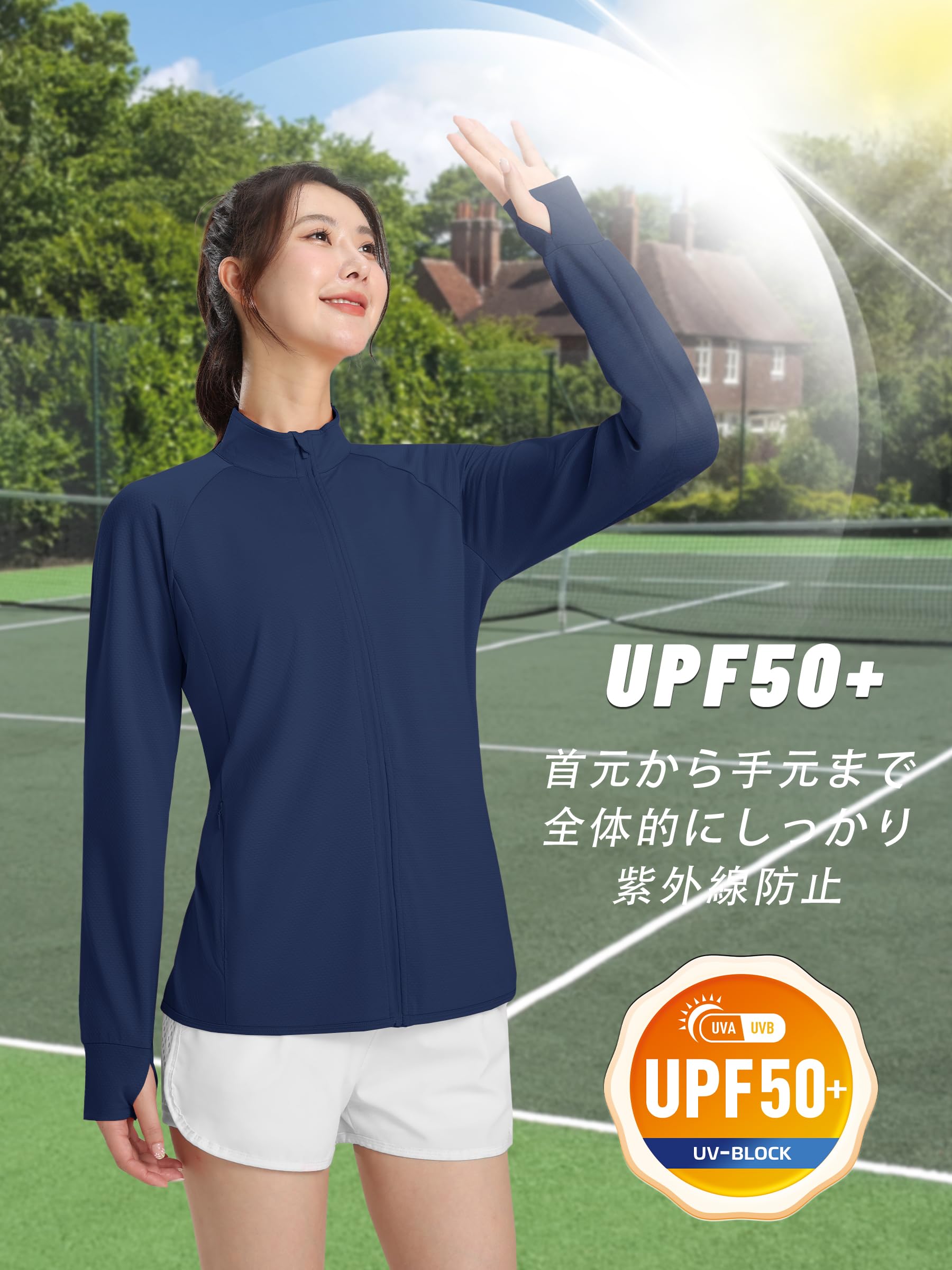 商品情報商品の説明主な仕様 【素材構成】 このラッシュガードの素材はポリエステル85%、スパンデックス15%です。薄手軽量で、通気性、伸縮性、吸汗性、速乾性に優れた素材なので、汗で肌がべたつきにくいし、いつも快適な状態を保ちます【UVカット・UPF50+】 このUPF50+のラッシュガードは着るだけで強い紫外線から肌を守り、日焼けを防ぎます。そして、袖口の指穴仕様は袖のずり上がりを防ぎますし、手までしっかり肌をまもります。立て襟設計とファスナーガード付きで、首まで日焼けを防ぐだけでなく、怪我を防止します【ポケット】 実用的なジッパーポケットが2つと内ポケットが2つあり、携帯電話やカード、現金など大切なものを便利に収納できます【デザイン】 1.この長袖ラッシュガードはジップアップのデザインなので、簡単に着脱できます。2.暑い夏だけでなく、春や秋のファッションジャケットとしても活用できます。3.体にフィットするバージョンで、多くのスタイルに適します。4.着丈はヒップまであり、体型をカバーしてくれます【幅広く活躍】 このuvジャケットはスポーツやちょっとしたお出かけの日焼け止め対策など幅広いシーンでも紫外線からお肌を守ることができます。例えば、ヨガ、テニス、ゴルフ、トレーニング、ジョギングなど。他に、冷房する室内でやや寒のときにも、海やプールで体が冷えてしまったときにも防寒としても活用できます