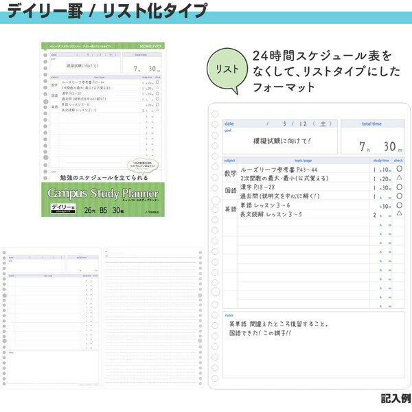商品名コクヨ キャンパス スタディプランナー ルーズリーフ B5 30枚 デイリー罫/ウィークリー罫 みえる化 リスト化 ガーリー 計画表説明テスト前勉強や受験勉強など、勉強のスケジュールが立てられるルーズリーフです。ルーズリーフなので1枚ずつ持ち歩けてかさばらない!「さらさら」の原紙はにじみにくく、インクが裏に透けにくいコクヨオリジナル原紙を使用しています。また、長期保存に適した中性紙です。パッケージの裏面では、使い方の詳細が記載されています。デイリー罫の3タイプとウィークリー罫の2タイプ、5種類の中からお選びください。デイリー罫 みえる化タイプ (定番の必要な項目だけを盛り込んだシンプルなフォーマット)デイリー罫 リスト化タイプ (24時間スケジュール表をなくして、リストタイプにしたフォーマット)デイリー罫 みえる化タイプ・ガーリー (項目欄にかわいい模様をあしらったガーリーテイスト)ウィークリー罫 みえる化タイプ (定番の必要な項目だけを盛り込んだシンプルなフォーマット)ウィークリー罫 みえる化タイプ・ガーリー (項目欄にかわいい模様をあしらったガーリーテイスト)【サイズ】B5【穴数】26穴、丸穴【紙質】上質紙【枚数】30枚【紙厚】75g/・0.10mm程度【寸法】タテ257×ヨコ182品番SELECTこの商品について 必ずご確認ください配送についてメール便での配送になります。→ご利用の際は必ずお読みください 送料について ご注文合計額が¥1000 (税込)以上で、全国一律『送料無料』です。 →詳細はこちら返品→返品・交換・キャンセルについて※メール便は、日時指定、代金引換、ギフトラッピング・熨斗サービスに対応しておりません。