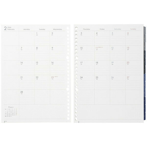 商品名マルマン 2026年 手帳用リフィル ルーズリーフダイアリー B5 月間+週間 片面1週間説明マルマンオリジナル筆記用紙で書きやすい!バインダーとの連携でオリジナルダイアリー編集が可能なルーズリーフダイアリーです。・B5サイズのバインダーに最適な26穴タイプ、2穴にも対応可能です・カラータブが四半期(3ヵ月)ごとに色分けされ、見やすいです・月間ダイアリーには、便利な次月カレンダーが付いています・週間ダイアリーには、1日を午前と午後に分割しスケジュールが書けます・週間ダイアリーのメモページには、スケジュールの内容を細かく記入できます●サイズ:B5 W189xH257mm●罫線:月間+週間●穴数:26穴●製本:ー●枚数:154枚●用紙:筆記用紙MPS-N80g/m2●備考:ー品番LD376-26この商品について 必ずご確認ください配送についてメール便での配送になります。→ご利用の際は必ずお読みください 送料について ご注文合計額が¥1000 (税込)以上で、全国一律『送料無料』です。 →詳細はこちら返品→返品・交換・キャンセルについて※メール便は、日時指定、代金引換、ギフトラッピング・熨斗サービスに対応しておりません。