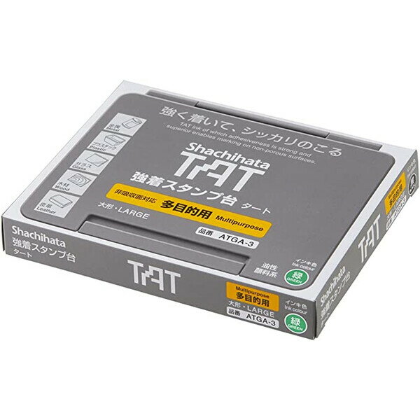 商品名シヤチハタ 強着 スタンプ台 TAT 多目的用 大型 緑 ATGA-3-G説明金属やプラスチック、布、革、ガラスなど、現代には様々な素材があふれています。そんなインキを吸収しにくい素材へのなつ印を可能にしたのがTATシリーズです。品番表示やサイズ表示、検印などに利用でき、いろいろな業種で活躍します。超微細粒子が非吸収面にも印影をしっかり残す油性顔料系インキ採用【盤面サイズ】106×67mm【本体サイズ】?13.4 x 10.7 x 1.9 cm【重量】150 g【インクカラー】緑【対応素材】金属・プラスチック・ガラス・陶器・布・皮革・木材等【ご注意1】インキの乾燥を防ぐため、スタンプ台をアルミ袋に入れて保管してください【ご注意2】必ず同じ種類・同じ色のインキを補充してください※異なるインキの混用は絶対にしないでください品番ATGA-3-Gこの商品について 必ずご確認ください配送についてメール便での配送になります。→ご利用の際は必ずお読みください 送料について ご注文合計額が¥1000 (税込)以上で、全国一律『送料無料』です。 →詳細はこちら返品→返品・交換・キャンセルについて※メール便は、日時指定、代金引換、ギフトラッピング・熨斗サービスに対応しておりません。