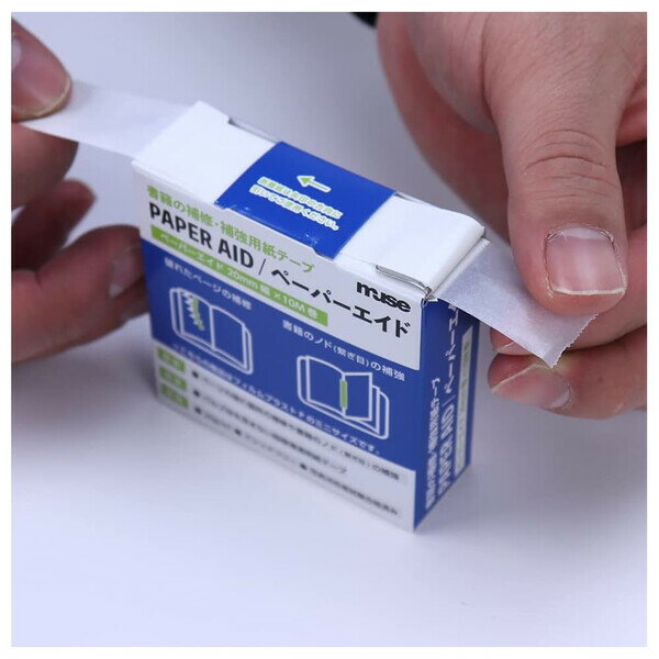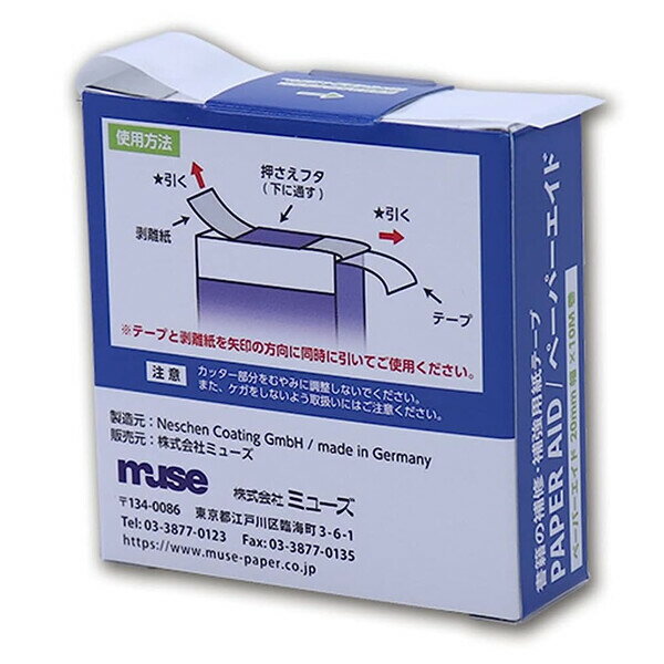 商品名補修テープ ペーパーエイド 20mm幅 10m巻 アシッドフリー 透明 コピー可 写真 本 楽譜 補強 図書館 ドイツ製 ミューズ説明世界各国の図書館で使用されている「フィルムプラストP」のミニサイズ!図書館先進国のドイツで生まれた、Neschen AG社製の超極薄補修テープ「ペーパーエイド」です。破れてしまった大切な本や、破れやすい教科書・絵本・料理本・楽譜などの補修にオススメ。お子さまの絵や、漫画のスクリーントーンの固定などに使用することもできます。補修跡が分かりにくい、厚さ23マイクロメートルの超極薄タイプ。コピーを取ってもテープが写りません。無酸性水溶性糊(アシッドフリー)を使用しているので、経年変化による変色などの心配がありません。貼る前のテープの色は透明度の高い白色ですが、貼付後は素材に馴染み目立ちません。色が変化したり、固くなることなく長期間にわたって透明感を維持し続けます。写真活性度試験(PAT)資格取得済み商品です。紙の中でもデリケートな素材の“写真”に適した製品と認められている。大切な紙製品の補修に安心して使用することができます。【サイズ】テープ=20mm×10m巻【材 質】テープ=中性紙、糊=水溶性無酸性糊(アシッドフリー)【生産国】ドイツ※素材が中性紙なので、補修した後でも力を加えると破れることがあります。品番PAA-428この商品について 必ずご確認ください配送についてメール便での配送になります。→ご利用の際は必ずお読みください 送料について ご注文合計額が¥1000 (税込)以上で、全国一律『送料無料』です。 →詳細はこちら返品→返品・交換・キャンセルについて※メール便は、日時指定、代金引換、ギフトラッピング・熨斗サービスに対応しておりません。