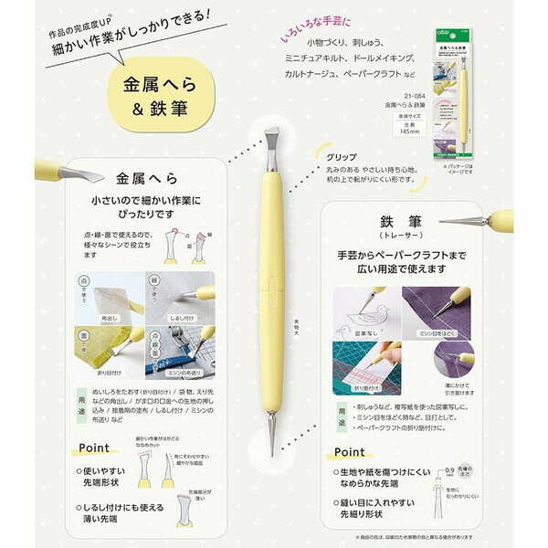 商品名クロバー 金属へら&鉄筆 細線 しるし付け 折り目付け 目打ち 裁縫道具 刺しゅう キルト クラフト 手芸 作品 ハンドメイド説明ハンドメイドの作品の完成度UP!細かい作業がしっかりできる「金属へら&鉄筆」です。いろいろな手芸に使えます。小物づくり、刺しゅう、ミニチュアキルト、ドールメイキング、カルトナージュ、ペーパークラフト etc.グリップは、丸みのある やさしい持ち心地。机の上で転がりにくい形です。クルっと持ち替えて使えるツインタイプ。「金属へら」は、ななめカット&緩やかな曲面が特徴で、小さく細かい作業にぴったり。点・線・面とさまざまなシーンで役立ちます。縫い代をたおす(折り目付け)、袋物・えり先などの角出し、がま口の口金への生地の押し込み、接着剤の塗布、しるし付け、ミシンの布送りなどに活躍します。「鉄筆(トレーサー)」は、先縫い目に入れやすい先細り形状。生地に引っ掛かりにくく生地や紙を傷つけにくい。刺しゅうなど複写紙を使った図案写し、目打ちとしてミシン目をほどく時、ペーパークラフトの折り筋付けなど広い用途で活躍します。【サイズ】全長=約145mm【材 質】樹脂部=ABS樹脂、金属部=綱(ニッケルメッキ)【入 数】1本【仕 様】金属へら、鉄筆・細線用(φ0.9mm)【生産国】日本 (柄=中国)※両方の先端は、とても細く尖っています。取扱にはご注意ください。品番21-084この商品について 必ずご確認ください配送についてメール便での配送になります。→ご利用の際は必ずお読みください 送料について ご注文合計額が¥1000 (税込)以上で、全国一律『送料無料』です。 →詳細はこちら返品→返品・交換・キャンセルについて※メール便は、日時指定、代金引換、ギフトラッピング・熨斗サービスに対応しておりません。
