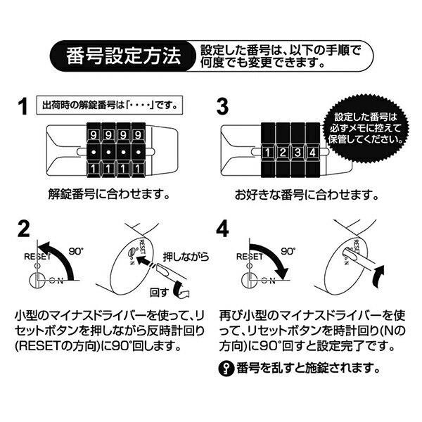 メーカー希望小売価格:1,760円 特別価格にて販売中サイズ W64×H67×D26mm シャックル太さ 直径7.8mm カラー 全2色/ブラック(BK) レッド(RD) MEMO 4桁ダイヤル。お好みの番号に設定できます。 ツル部に上部な焼入れ鋼を使用。 生産国 MADE IN TAIWAN 配送について 宅配便