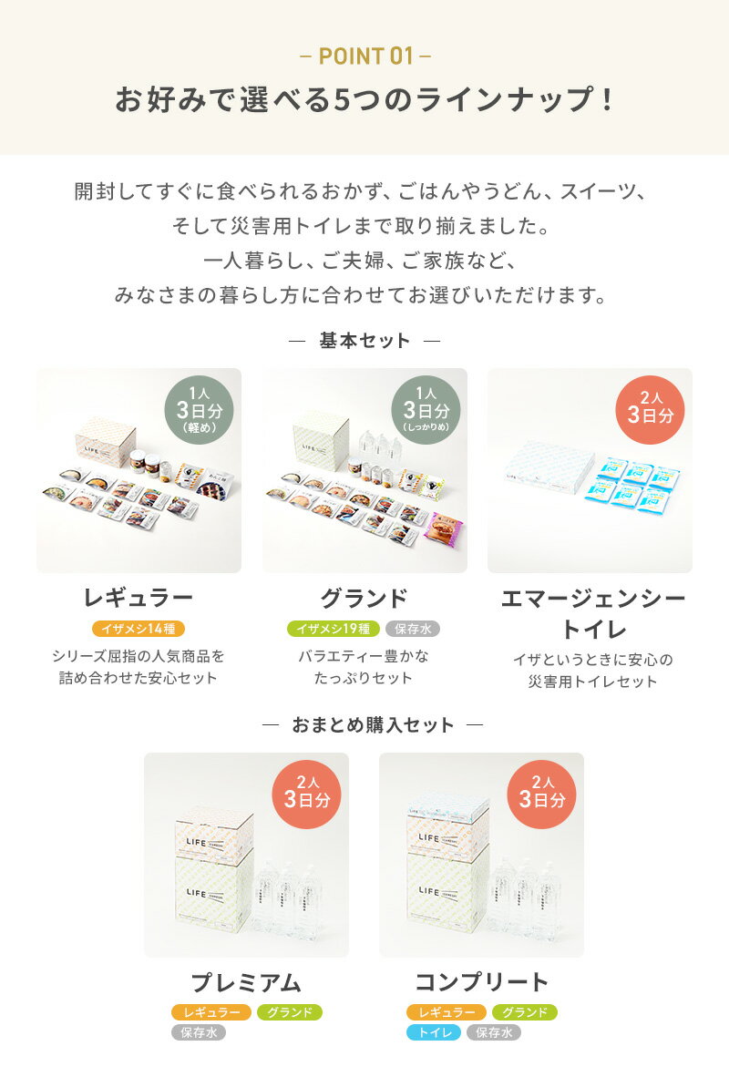 味にこだわった長期保存食「IZAMESHI」から、選りすぐりの商品を詰め込んだ「LIFE IZAMESHI」。 ひとり暮らし、ご夫婦、ご家族など、暮らし方に合わせて選べる5種類をご用意しております。 人気商品を詰め込んだレギュラー、バラエティ豊かなグランド、7年保存水2Lを1ケース(6本)をセットにしたプレミアムに、トイレセットを加えたコンプリートセット。 保存食、水、トイレの全てを完備したパッケージです。 ボックス側面には記入欄を設けており中身と賞味期限を簡単に管理することができます。 食べたら補充するローリングストックにも便利です。 大切な人の「いざ」の場面で活躍する「イザメシ」は、贈り物にもおすすめです。 ■お召し上がり方 【ごはん】 (1)封を開け、スプーンと乾燥剤を取り出します。 (2)袋の内側の線まで水またはお湯を注ぎ、チャックを閉めます。水の分量によってお好みのかたさでお作りいただけます。 (3)水で60分、お湯で15分時間をおけばできあがり。 ※調理用の水は付属しておりません。別途ご用意ください。 【丼】 (1)ごはん袋を開封し、脱酸素剤を取り出してください。 (2)レトルト袋を開封して中身をごはん袋へ入れ、スプーンでよくかき混ぜてください。 (3)ごはん袋のチャックを閉めてお待ち下さい。目安は常温で約60分です。 湯せんでレトルト袋を温め、アルファ化米と混ぜた場合、約20分で出来上がります。 【おかず・粥・リゾット】 封を切ってそのままお召し上がりいただけます。 温める場合は、沸騰したお湯または、お皿に中身をあけて電子レンジで温めてください。 【デニッシュ・マフィン】 缶から出してそのままお召し上がりいただけます。 缶切りなしで開けることができる、イージーオープン缶です。 【うどん】 (1)白い蓋を外し、缶を開け、袋を2つ取り出してください。 (2)袋を開封して中身を缶の中に入れ、熱湯を注水線まで注いでください。(目安量415ml) (3)白い蓋をかぶせ10分待ったあと、よくかき混ぜてお召し上がりください。 【餅】 (1)トレーの中の乾燥もちをとりだし、外袋へ入れます。取り出したトレーの片側にアルミ袋に入った水の封を切り、およそ半分の水(約40cc)を入れます。 (2)乾燥もちを重ねないように約1分間、完全に水に浸します。(※おもちが水を吸い込んで足りなくなったら、新しくつぎたしてください。) (3)おもち全体に水がしみこんだら、はしでおもちを別皿にうつしてください。添付の乾燥あんこを水で戻し、お餅とあわせてお召し上がりください。 ■トイレセットの使い方 ・付属の排便袋に用を足して、抗菌性凝固剤を振りかけるだけで、あとは可燃ごみとして処理できます。 ・既存の便器やポータブルトイレに排便袋をかぶせて使用しますので、トイレが汚れる心配もありません。 ・水を必要としないのでいつでもどこでも排泄できます。 内容量目安2人3日分 セット内容保存食計 26種33点(ごはん11種、おかず7種、うどん2種、パン3種、スイーツ3種)、2L水9本、簡易トイレセット セット詳細 【レギュラー】 ごはん、小松菜ご飯、ドライカレー、梅しらす雑炊、きのこと鶏の玄米スープごはん、濃厚トマトのスープリゾット、梅と生姜のサバ味噌煮、トロトロねぎの塩麹チキン、名古屋コーチン入りつくねと野菜の和風煮、オレンジマフィン、おだしじんわりきつねうどん、もちもちお餅のちからうどん、チョコバー、あんこ餅×各1個 【グランド】 ごはん、ひじきご飯、五目ご飯、玉子粥、梅しらす雑炊、肉じゃが、けんちん汁、濃厚トマトのスープリゾット、大豆たっぷりカレーリゾット、梅と生姜のサバ味噌煮、ヨーグルトが隠し味のスパイシーチキンカレー、ひじきときのこのみぞれハンバーグ、素材を活かした鶏ごぼう丼、メープルデニッシュ、あずきマフィン、オレンジマフィン、おだしじんわりきつねうどん、チョコバー、フルーツドロップ×各1個、7年保存水2L×3本 【7年保存水】2L×6本 【トイレセット】1セット(5回分)×6セット 賞味期限ごはん、小松菜ご飯、ドライカレー、ひじきご飯、五目ご飯、マフィン、フルーツドロップ:製造より5年間、7年保存水:製造より7年間、その他:製造より3年間 ※製造から6ヶ月以内の商品をお届けいたします。 ※保存年数は製造日より起算しています。 保存方法直射日光および高温多湿な場所を避けて常温で保存してください。 ご注意 ・開封後は賞味期限にかかわらずお早めにお召し上がりください。 ・栄養成分表など詳細は各商品ページでご確認ください。 ・商品の仕様・価格は、改良のため予告なく変更する場合があります。変更後は、順次自然切替えとなります。 ・トイレセットの凝固剤の使用期間は約10年間となっております。直射日光や高温多湿をさけて保管してください。 ・こちらの商品は3個口での発送となります。“食べない備蓄食から、おいしく食べる長期保存食へ”を コンセプトに、 災害時のための保存食としてだけでなく、いつもの食事に一品加えたいとき、 旅行