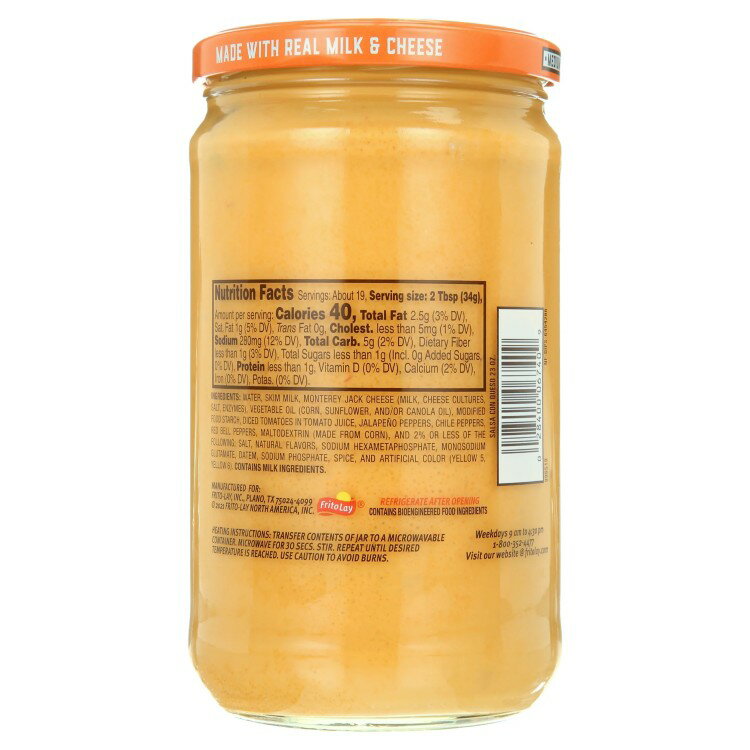 トスティトス サルサコンケソ 23オンス瓶1個入り 本物のモントレージャックチーズに完熟トマト、刻んだハラペーニョ、マイルドな赤ピーマンをブレンドして作られています お気に入りのトスティトス トルティーヤチップスと相性抜群 常温保存可能なサルサディップ 象徴的なトスティトスブランドのサルサディップ 次のパーティーやテールゲートに最適です 本物の牛乳とチーズを使用