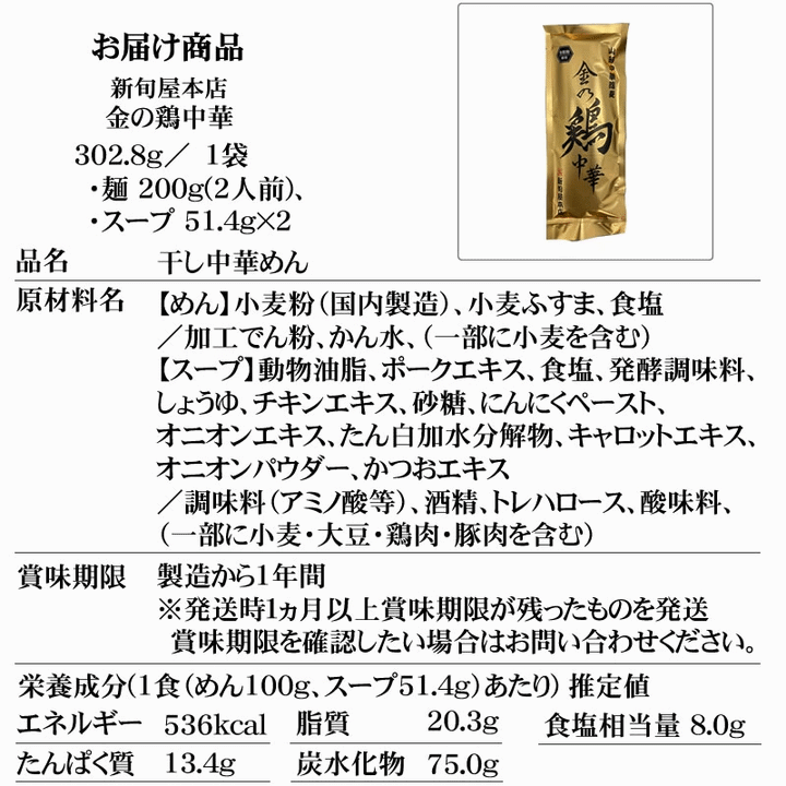 ■名称 新旬屋本店 金の鶏中華 ■品名 干し中華めん ■原材料名 【めん】小麦粉(国内製造)、小麦ふすま、食塩/加工でん粉、かん水、(一部に小麦を含む) 【スープ】動物油脂、ポークエキス、食塩、発酵調味料、しょうゆ、チキンエキス、砂糖、にんにくペースト、オニオンエキス、たん白加水分解物、キャロットエキス、オニオンパウダー、かつおエキス/調味料(アミノ酸等)、酒精、トレハロース、酸味料、 (一部に小麦・大豆・鶏肉・豚肉を含む) ※鶏肉は商品に含まれておりません。 別途ご用意ください。  ■内容量 302.8g(麺200g(2人前)、スープ51.4g×2)/1袋あたり ■保存方法 直射日光・高温多湿を避けて保存してください。 ※開封後は密封して冷蔵庫(10℃以下)に保管し、早めにお召し上がりください。 ■賞味期限  製造から1年間 ※発送時1ヵ月以上賞味期限が残ったものを発送。 賞味期限を確認したい場合はお問い合わせください。 ■製造者 合資会社 酒井製麺所 ■送料 無料 ■配送 宅配便で発送させて頂きます。2010年 ラーメングランプリ 第3位 2011年 ラーメングランプリ 優勝 2019年 東京ラーメンショー 最優秀賞 2020年 ラーメングランプリ 優勝 2021年 ラーメングランプリ 優勝 乾麺一筋35年の職人と1年かけ作り上げた究極の麺!! タレは新旬屋本店塩タレと鶏油を使用した黄金のスープ!!