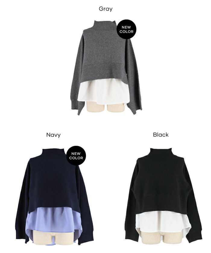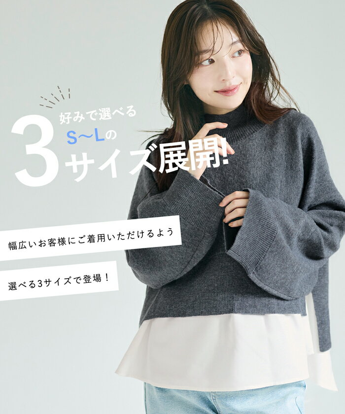 ニットサイズ(平置き/cm)SML着丈394245身幅55.55860.5袖丈656667天幅242424前下がり6.56.56.5ブラウスサイズ(平置き/cm)SML着丈前58後ろ68前60後ろ70前62後ろ72前下がり9.59.59.5アイテム説明トレンド感たっぷりの、シャツ×ニットのレイヤードトップス。ゆるっとシルエットで、秋らしい抜け感コーデに。一枚で重ね着風が完成して、着るだけで旬スタイル。カジュアルにもきれいめにもマッチする万能アイテム!伸縮性ニットあり/ブラウスなし透け感ニットなし/ブラウスBlack・Grayのみあり裏地なしポケットなし素材ニット部分:ポリエステル40%アクリル35%ナイロン25%布帛部分:ポリエステル100%生地感柔らかいニット生地/薄手のポリエステル生地モデル身長167cm/160cm注意点素材の特性上、色落ちしやすいのでご注意下さい。摩擦等により、毛羽立ちや毛玉が生じやすいため、連続着用はお避け下さい。お洗濯方法によっては縮みや色あせの可能性あり。乾燥機等のご使用はお控え下さい。※商品単体でのお写真が実物に最も近いお色味となっております。※生地や素材の性質により2cm前後(ニット製品に関しては4cm程度)サイズ誤差が出る場合がございます。※モデル着用写真は撮影環境や、お客様のモニター環境により、多少実際のカラーと異なって見えます。※当商品は機械による生産の過程上、『生地を織る際の糸の継ぎ目』や多少の『ほつれ』、繊維の『混紡』、形やサイズに多少の『誤差』が生じる場合がございます。※お客様に喜んでいただけますよう、最良のお値段でご提供できるよう努めております。今後もより良いデザインと商品をご提供させて頂くためにも素材や縫製につきましては、何卒ご理解いただきますようお願い申し上げます。