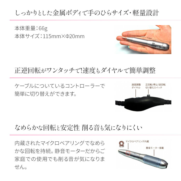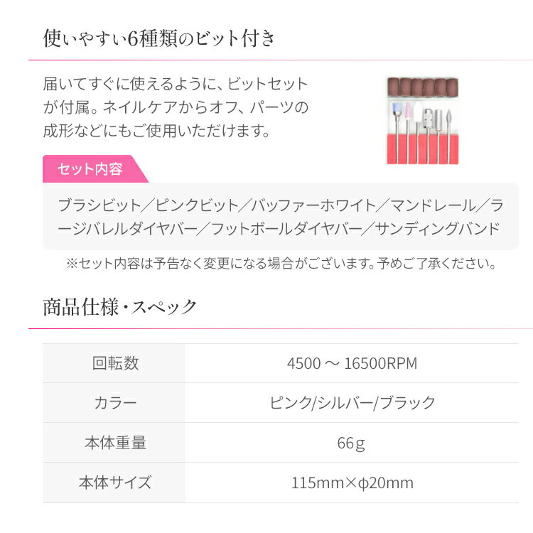 6種類のビットと、サンディングバンド6個が付属! ブラシビット ・爪の表面や裏側の手入れに使用します。ファイルによるバリやダスト、爪の裏に入ったゴミをかき出すことが出来ます。(お掃除用) ・プッシャーで押し上げたルーススキンをかき出す際にも使えます。 ピンクビット ・ルーススキンや角質を取り除くアタッチメントです。 ・細かい甘皮や頑固な角質を簡単に除去します。 ・皮膚を傷つけることがないので、細かい部分も作業がしやすいです。 バッファーホワイト ・表面をなめらかにする際にこ使用ください。 ・ピンクビットで磨いた後、このビットで磨けば驚くほどツヤツヤに。 ・シワ(発育線)が小さい場合は、このビットから削り始めてください。 マンドレール ・サンディングバンドを取り付けてご使用ください。 ・使用時に外れないように、根元までしっかり差し込んでください。 ・やわらかめで、ジェルを削るのに最適です。 ラージバレルダイヤバー ・ケアやスカルプチュアネイルの整形・リペアなどに使われます。 ・アクリルの厚さ調節をすることが出来ます。 ・スマイルラインの削り出しにも最適です。 フットボールダイヤバー ・ネイルケアやスカルプチュアネイルの整形・ラインストーンのはめ込み・Cカーブの整え・爪の裏側にはみ出たグルーや段差の修正などに使われるビットです。 サンディングバンド ・ジェルのオフや、ジェル前の自爪のサンディングに最適です。 ・表面の光沢を取り除き、角質の除去も素早く出来ます。 ・熱を感じる場合は、同じ場所を削り続けることは避けてください。 KRD2000の仕様・スペック 回転数 4500 ~ 16500RPM カラー ピンク/シルバー/ブラック 本体重量 66g 本体サイズ 115mm×φ20mm 付属品 ・USBケーブル ・USB式アダプター100V-240V(50〜60Hz) ・ビット6種類(サンディングバンド6個) ※用途に合わせてビットをご使用ください。 ・取扱説明書 ・保証書 ※お使いのモニター設定、お部屋の照明等により実際の商品と色味が異なる場合がございます。