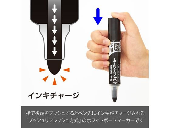 【仕様】●線幅:4.0mm●インク色:黒●長さ:126mm●油性アルコール系インキ●丸芯●直液式●プッシュリフレッシュ方式●注文単位:1本●グリーン購入法適合●GPNエコ商品ねっと掲載【検索用キーワード】ボードマーカー ホワイトボード マーカー Pentel ペンテル WHITEBOARDMARKER プッシュリフレッシュ方式 キャップ式 くろ クロ ブラック バラ売り 1本売り EMWL5WA 会議 白板用 白板マーカー 油性インク 油性インキ アルコール系油性顔料インク アルコール系油性顔料インキ ホワイトボードペン ホワイトボード用ペン ホワイトボード用マーカー RPUP_03 761382薄くなってきたらワンノック。プッシュリフレッシュ方式採用。