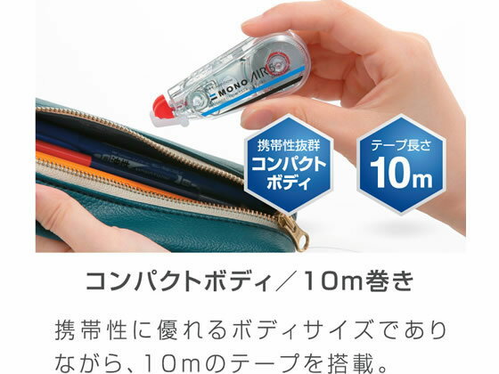 【仕様】新機構「エアータッチシステム」搭載により修正テープを切るための抵抗が不要となり、消し心地を大幅に軽くすることに成功しました。携帯に優れるボディサイズながら10mのテープを搭載。●テープ幅:4.2mm●テープ長さ:10m●カラー:ライム●使いきりタイプ●静音設計●グリーン購入法適合【備考】※メーカーの都合により、パッケージ・仕様等は予告なく変更になる場合がございます。【検索用キーワード】とんぼ鉛筆 tombow しゅうせいてーぷ シュウセイテープ MONOAIR ものえあー 字消しテープ ホワイトテープ 使い切りタイプ 使いきりタイプ 使い捨て エアータッチシステム 4.2mm幅 10m 10メートル CTCA4C60 らいむ 黄色 きいろ キイロ イエロー 軽い モノ修正テープ MONO_修正テープ ヘッドカバー 手ブレ 削れにくい けずれにくい 剥がれにくい はがれにくい 使いやすい つかいやすい コンパクト 静か 静音 密着 オフィス オフィス 事務所 持ち運び 携帯 収納 RPUP_03 MONO修正テープ R28514使いきるまで、驚くほど軽く消せる!