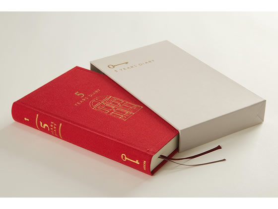 【仕様】金箔押しで高級感のある、日記本体とケース。1年目は1段目、2年目は2段目・・・前の年のできことを見返しながら書けます。毎月、扉・インデックスのイラストが変わります。●赤●5年連用●寸法:本体/縦185×横117×厚み25mm、ケース/縦192×横120×厚み30mm●材質:表紙/布クロス貼り、金箔押し●本文366ページ●横罫(罫幅6mm)●付録3ページ●しおりひも2本付【備考】※メーカーの都合により、パッケージ・仕様等は予告なく変更になる場合がございます。【検索用キーワード】MIDORI みどり でざいんふぃる にっき 横罫線入り 6mm 5年日記 5年分 5年用 五年用 五年連用 バラ売り 1冊売り 日付入り 日付指定 日記帳 記録 12851006 金箔押し 用途別ノ−ト アイボリー ベージュ レッド RPUP_05 R29479去年の自分に出会える日記。去年の今日、自分が何をしていたかを読みながら書ける5年連用タイプ。