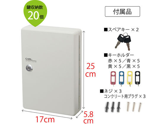 【商品説明】収納効率に優れた丈夫なスチール製キーボックスです。コンパクトサイズなので、省スペースでの保管が可能です。カラフルなキーホルダーは用途別に鍵を分類して管理でき、ネームシートがついているので掛け間違いや取り間違いを防ぎます。保管の際は鍵をかけておけるので安心です。本体裏側には壁掛け用の穴があり、付属のネジとコンクリートプラグにより壁に取り付けられます。【仕様】●サイズ:幅170×奥行58×高さ250mm●重量:1kg●材質:SPCC、PP●鍵収納数:20個●付属品:(キーホルダー)赤×5、青×5、黄×5、黒×5個入、取付用ネジ×3本、コンクリート用プラグ×3個、開錠用キー×2個●壁掛け用穴付(3ヶ所)●注文単位:1台【検索用キーワード】CARL かーる カール カール事務器 きーぼっくす keybox 鍵箱 鍵入れ ハードタイプ アイボリー CKB−C20−I CKBC20I 1個 1基 1台 鍵の保管 収納 整理 オフィス用品 家具 事務用品 名札、キーホルダー キーホルダー、キーボックス RPUP_02 prv_key R72529【鍵収納数20個】収納効率に優れたコンパクトタイプ。