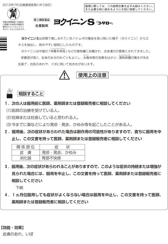 数量限定お一人様5個まで。【仕様】【リスク区分】第3類医薬品 【使用期限】使用期限まで5ヶ月以上あるものをお送りします。医薬品販売に関する記載事項(必須記載事項)は こちら【発売元、製造元、輸入元又は販売元】製造販売元:小太郎漢方製薬株式会社住所:〒531-0071 大阪市北区中津2丁目5番23号電話:06(6371)9106【商品区分・生産国】第3類医薬品・日本製【広告文責】フォーレスト株式会社0120-40-4016鈴木 ちはる(登録販売者)【商品説明】ヨクイニンs「コタロー」は民間で親しまれているはと麦の種皮を取り除いた種子(ヨクイニン)からエキスを抽出し、飲みやすい錠剤にしたものです。ヨクイニンは中国の「神農本草経」などの薬物書に記載され、古来漢方の要薬とされてきました。栄養価が高く、全身の水分のめぐりをよくし、水毒体質の改善をはかり、清熱排膿の働きがある生薬で、お肌のあれや、イボに用いて効きめがあります。【効能・効果】皮膚のあれ、いぼ●内容量:720錠【検索用キーワード】小太郎漢方製薬 コタロー こたろー よくいにんsこたろー 漢方薬 肌荒れ 肌あれ イボ 内服薬 錠剤 1本 720錠 第三類医薬品 医薬品 お薬 おくすり ドラッグ 5才以上 生薬エキスJAN:4987301501763 RPUP_03肌あれ、イボに
