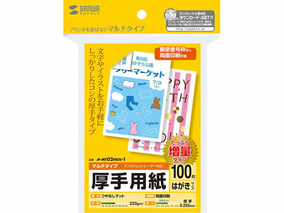 【レビュー投稿で100円OFFクーポン】【お取り寄せ】サンワサプライ マルチはがきカード 厚手 100枚 増量 ハガキサイズ インクジェット用紙 マット紙