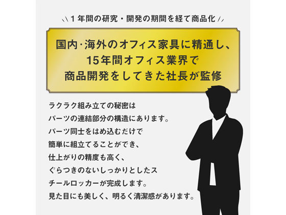 【商品説明】専門家が監修したハイパフォーマンスな鍵付きロッカー。小さな梱包サイズでこれまで搬入できなかった間口から搬入が可能。組立は工具不要。パーツ同士をはめ込むだけで女性でも簡単に組立できます。仕上がりの精度も高く、ぐらつきのないしっかりとしたスチールロッカーが完成します。【仕様】●カラー:ブラック●外寸法:幅380×奥行450×高さ1800mm●梱包重量:25.2kg●材質:本体・扉/スチール、粉体塗装、取手/アルミニウム、ABS樹脂●付属品:鍵5組(10本)●組立時間:約4分●注文単位:1台●お客様組立●保証期間:1年間 ※原則、軒先(玄関先)渡しとなります。階上、階下となる場合、またエレベーターのご使用ができない場合、段差があるなど、納品場所の状況によりましては1階軒先でのお渡しとなります。※こちらの商品は、個人宅の配送は行っておりません。お届け先が個人名様の場合、キャンセルとさせていただきます。お届け先が法人の場合、必ずお届け先に会社名をご記載ください。【配送不可地域について】沖縄・離島・遠隔地は配送不可地域となり、商品のお届けができかねます。お届け先が配送不可地域の場合、キャンセルとさせていただきます。予めご了承ください。【備考】※メーカーの都合により、パッケージ・仕様等は予告なく変更になる場合がございます。【検索用キーワード】LOOKIT ルキット るきっと ファシル FACILE ロッカー 幅380×奥行450×高さ1800mm 黒 ブラック 5人用 カギ付き 鍵付き オフィス 事務所 会社 店舗 病院 学校 業務用 更衣室 1列5段 隙間収納 収納家具 ロッカー スチールロッカー 更衣ロッカー オフィスロッカー ワードローブ 組立ロッカー FACS52FWBK FAC−S5−2−FW−BK 鍵付き シリンダー 物理鍵 業務用 会社用 資料 書類 貴重品 オフィス 事務所 執務室 学校 塾 病院 福祉施設 介護施設 会議室 ミーティングルーム 倉庫 スタイリッシュ RD8411工具不要で組立可能。ハイパフォーマンスな鍵付きロッカー。
