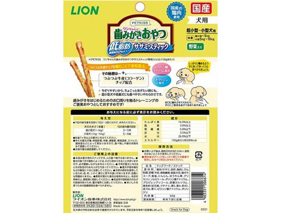 【ブラックフライデー限定★27日9:59迄店内ポイント2倍】【お取り寄せ】LION ワンちゃん歯みがきおやつ 低脂肪ササミスティック ヤサイイリ おやつ 犬 ペット ドッグフード