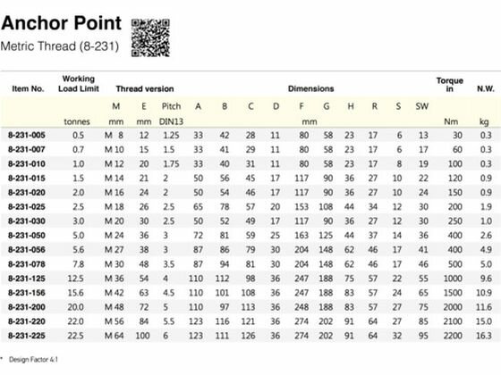 【商品説明】●大型金型の移動、反転作業に。大型コンクリート製品の移動、設置作業に。重量部材、機械装置などの移動、搬入、設置に。●取付面に対して、リング部が180°可動、軸方向に対しては360°回転します。●JIS型アイボルトでは不可能であった、横吊り作業や引き起こし作業が可能です。【仕様】●型番:8-231-010●基本使用荷重(t):縦吊り:2/90°横吊り:1 ●ボルトサイズ:M12 ●ねじ径:M12 ●寸法(mm)A:33 ●寸法(mm)B:40 ●寸法(mm)C:31 ●寸法(mm)D:11 ●寸法(mm)E:20 ●寸法(mm)F:80 ●寸法(mm)G:58 ●寸法(mm)H:23 ●破断荷重(kN):33●EN1677−1、ASMEB30.26適合品 ●安全率4倍 ●締付トルク(N・m):100●ボルトは表記の締付トルクに則って取り付けてください。【備考】※メーカーの都合により、パッケージ・仕様等は予告なく変更になる場合がございます。【検索用キーワード】YOKEアンカーポイントM122t ヨークアンカーポイントM122t YOKE荷役金具 8231010 荷役用品 吊りクランプスリング荷締機 アイボルト 4713037053258 1153365 YOKE アンカーポイント M12 2t 8−231−010 R5996G