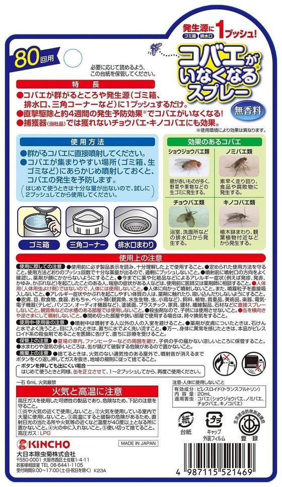 【レビュー投稿で100円OFFクーポン】金鳥 コバエがいなくなるスプレー 80回 20mL スプレータイプ 殺虫剤 殺虫 防虫剤