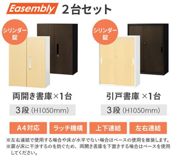 【商品説明】省スペース設計ながらタテヨコA4サイズ対応で無駄なくしっかり収納可能。上下左右自由な連結で、大型壁面収納からコンパクトな窓下収納まであらゆるニーズにこたえます。【仕様】●外寸/両開き書庫:幅800×奥行400×高さ1050mm/引戸書庫:幅800×奥行400×高さ1050mm●カラー/ダークブラウン●材質/本体・扉:スチール(粉体塗装)●機能/棚板12mmピッチで上下可動●鍵/シリンダー錠●付属品/両開き書庫:棚板×2枚、鍵×2本、連結部材/引戸書庫:棚板×2枚、鍵×2本、連結部材●重量/両開き書庫:33.3kg/引戸書庫:30.6kg●耐荷重/両開き書庫:40kg(棚板1枚あたり)/引戸書庫:40kg(棚板1枚あたり)●セット内容/両開き書庫(EA−8040−3R−C−FW)×1台、引戸書庫(EA−8040−3H2−C−FW)×1台●組立品【別途送料について】沖縄・離島・一部北海道や山間部へのお届けの場合、別途送料の発生、もしくはお届けができない場合がございます。別途送料が発生する場合、ご注文後、翌営業日中にご案内いたします。 ※原則、軒先(玄関先)渡しとなります。階上、階下となる場合、またエレベーターのご使用ができない場合、段差があるなど、納品場所の状況によりましては1階軒先でのお渡しとなります。 【お届け日・時間指定について】お届け日・時間の指定は承れません。【備考】※メーカーの都合により、パッケージ・仕様等は予告なく変更になる場合がございます。【検索用キーワード】Netforce ネットフォース ねっとふぉーす 引戸書庫 両開き書庫 スチール書庫 本棚 両開き書庫:幅800×奥行400×高さ1050mm 引戸書庫:幅800×奥行400×高さ1050mm ダークブラウン 3段 両開き書庫:棚板×2枚、鍵×2本、連結部材 引戸書庫:棚板×2枚、鍵×2本、連結部材 オフィス 会社 事務所 学校 病院 EA−8040−3R3H2−C−FW−DBR EA80403R3H2CFWDBR キャビネット ロッカー スチールキャビネット R344MHオフィス収納シリーズEasembly(イーセンブリー)の書庫セット。