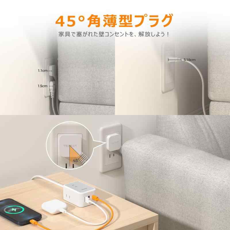 延長コード 2m 薄型 電源タップ usb コンセントタップ たこあしコンセント テーブルタップ TESSAN 3個AC 1個タイプC 2個タイプA 電源コード type-c タコ足配線 隙間【電源タップ 薄型】延長コード 2m 薄型と薄型プラグの採用により、狭い隙間にも簡単に設置可能です。家具の後ろや壁際でも、スペースを有効に活用できるため、見た目もすっきりします。それに、L型プラグを壁のコンセントに差し込んだときに他のコンセントを妨げません。【一台6役/干渉しにくい】この延長コードは正面と左右に1口ずつACコンセントを搭載しているほか、USBポート(USB-A2、USB-C1)も3口用意されています。そのため、最大6台まで同時に充電が可能で、コンセントが足りないという問題を解決します。また、ACコンセントが左右に分散しているため、使用時の干渉を防ぎながら接続可能です。【省スペース設計】サイズはわずか7.8x5.2x3.7cm、264gの小型で軽量なusb付き電源タップです。場所を取らないコンパクトなデザインなので、持ち運びも楽です。旅行や出張に最適です。【壁掛け/テーブルに】テーブルタップの底面には壁掛け用の穴がついており、机の脇や壁など必要な場所に取り付けることができ、空間をすっきりさせることができます。滑り止めマットが付いているので、デスクの上にしっかりと置くことができます。【スマートIC】 たこあしコンセントのUSB-Aポートは最大12w出力に対応し、デバイスに最適な電流を流す「スマートIC」により、安全に充電できます。また、Type-Cポートを搭載しており、出力は15wで、充電をより便利にします。