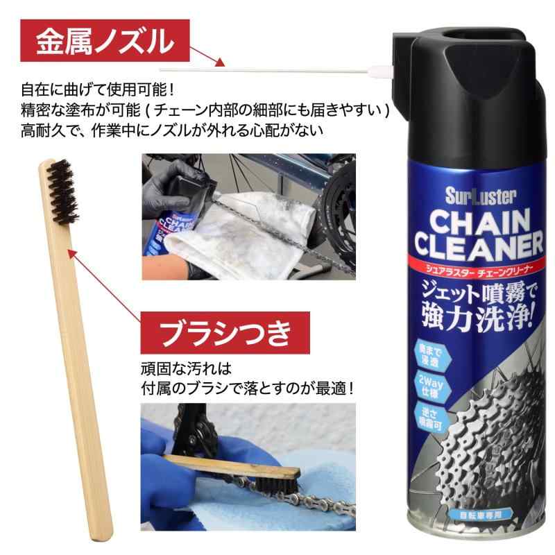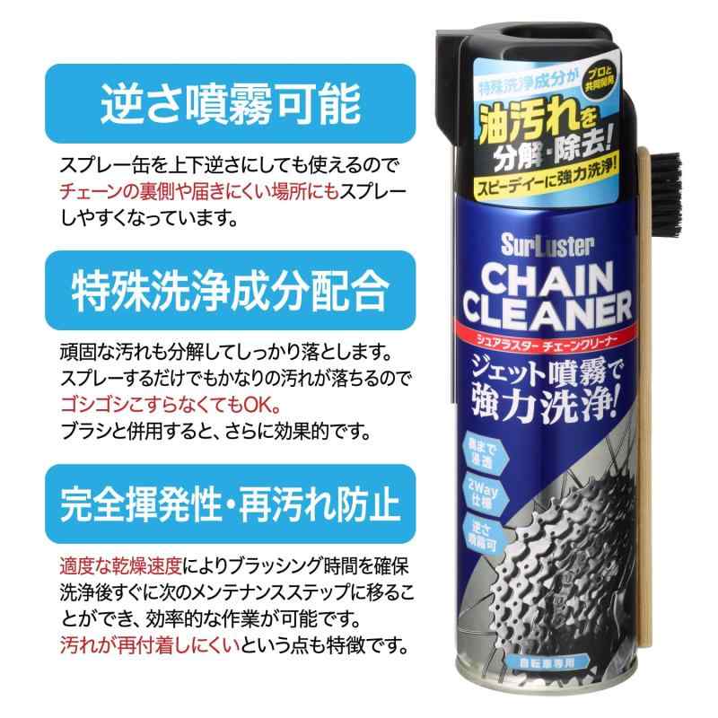 SurLuster(シュアラスター) チェーンクリーナー(自転車用) ブラシ付き 油汚れ分解 ジェット噴霧 特殊洗浄成分配合 チェーン洗浄 揮発 逆さ噴霧可能 スプロケット・ディレイラーにも S-145容量:480ml商品モデル番号:S-145種類:単品原産国:日本ブランド:Surluster(シュアラスター)